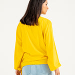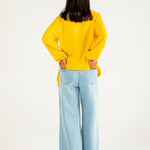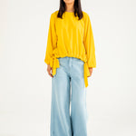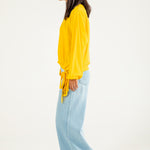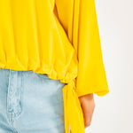 Lightweight yellow cotton top with a flowy fit, featuring tie details on both sides of the hem for a subtle twist.