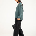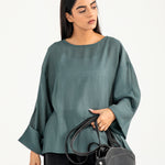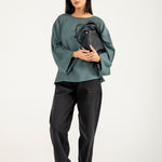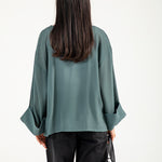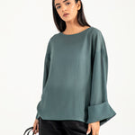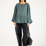 Teal jacquard top in a flowy synthetic blend, featuring oversized sleeves with a roll-up detail for a clean finish.