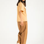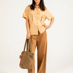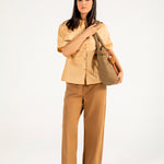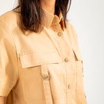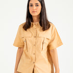 Khaki safari-style top in structured cotton, featuring a boxy fit, short sleeves, chest pockets with strap and buckle detail, and matching buttons.