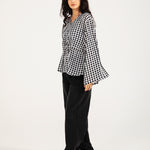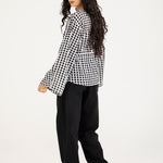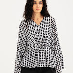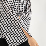 Flowy top in a soft synthetic blend, featuring black geometric shapes on a white base, full-length slit sleeves, black buttons, and a drawcord tie at the waist that adds shape.
