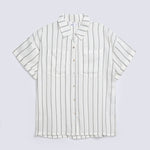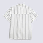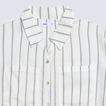 Button down shirt in a flowy synthetic blend, featuring vertical stripes on an off white base.