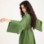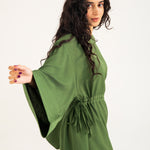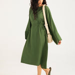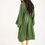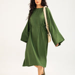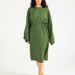 Olive midi dress in a flowy cotton synthetic blend with subtle texture, featuring long ultra-wide sleeves and adjustable waist ties on both sides for added shape.