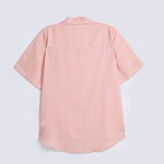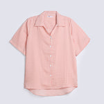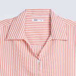 Peach and white striped shirt in a synthetic blend, featuring a Johnny collar and finished with white buttons.