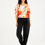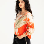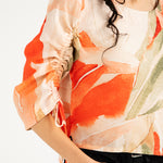 Cut from a light synthetic blend, this top features a warm-toned leafy print in orange and beige, with sleeve ties.