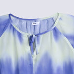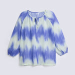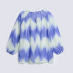 Sheer synthetic blend top with an all over tie dye print in shades of blue and off white, featuring long sleeves with elasticated cuffs and a tie detail at the neck.