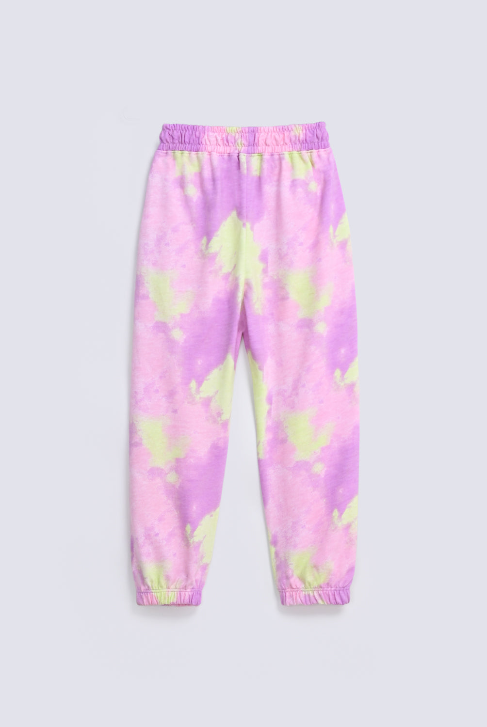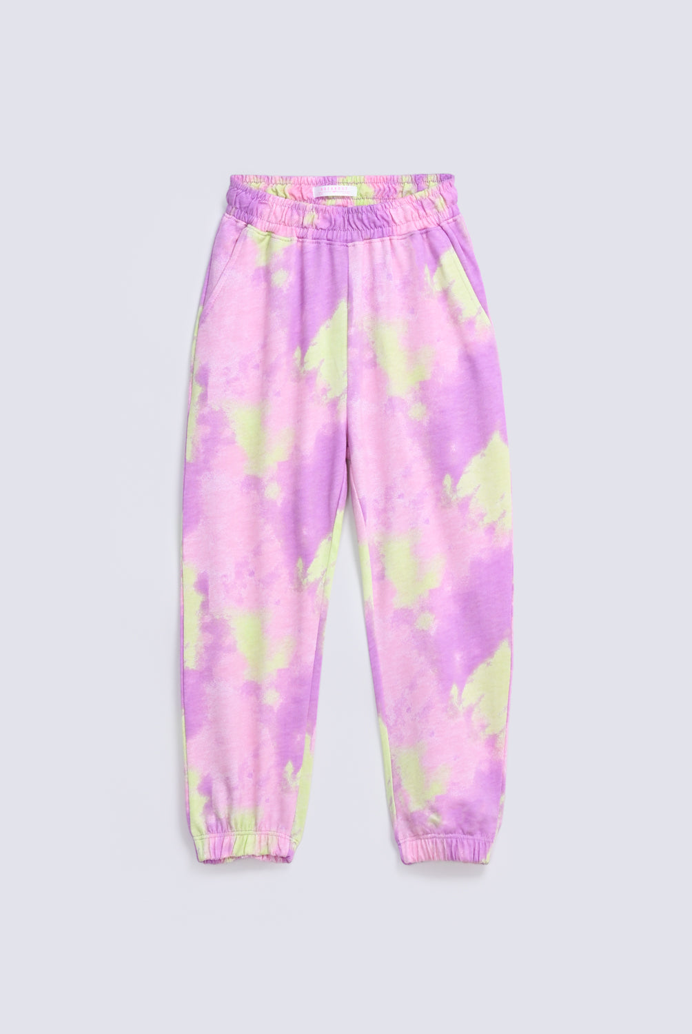 Swirled in dreamy shades of pink, purple, and yellow, these soft trousers feature an elasticated waistband, side pockets, and cuffed hems.