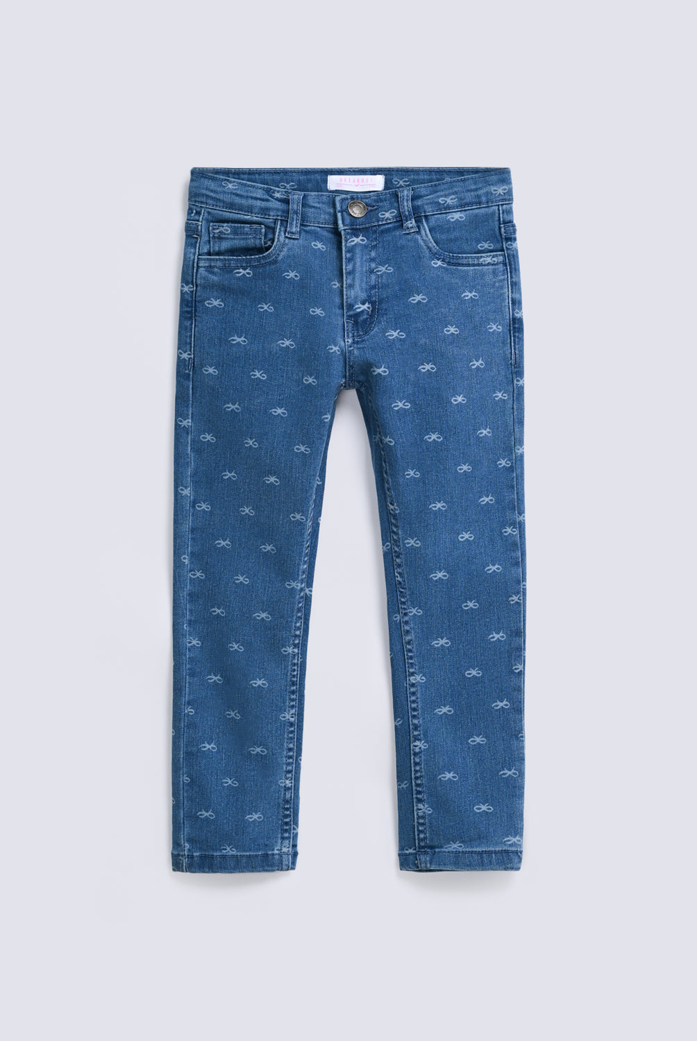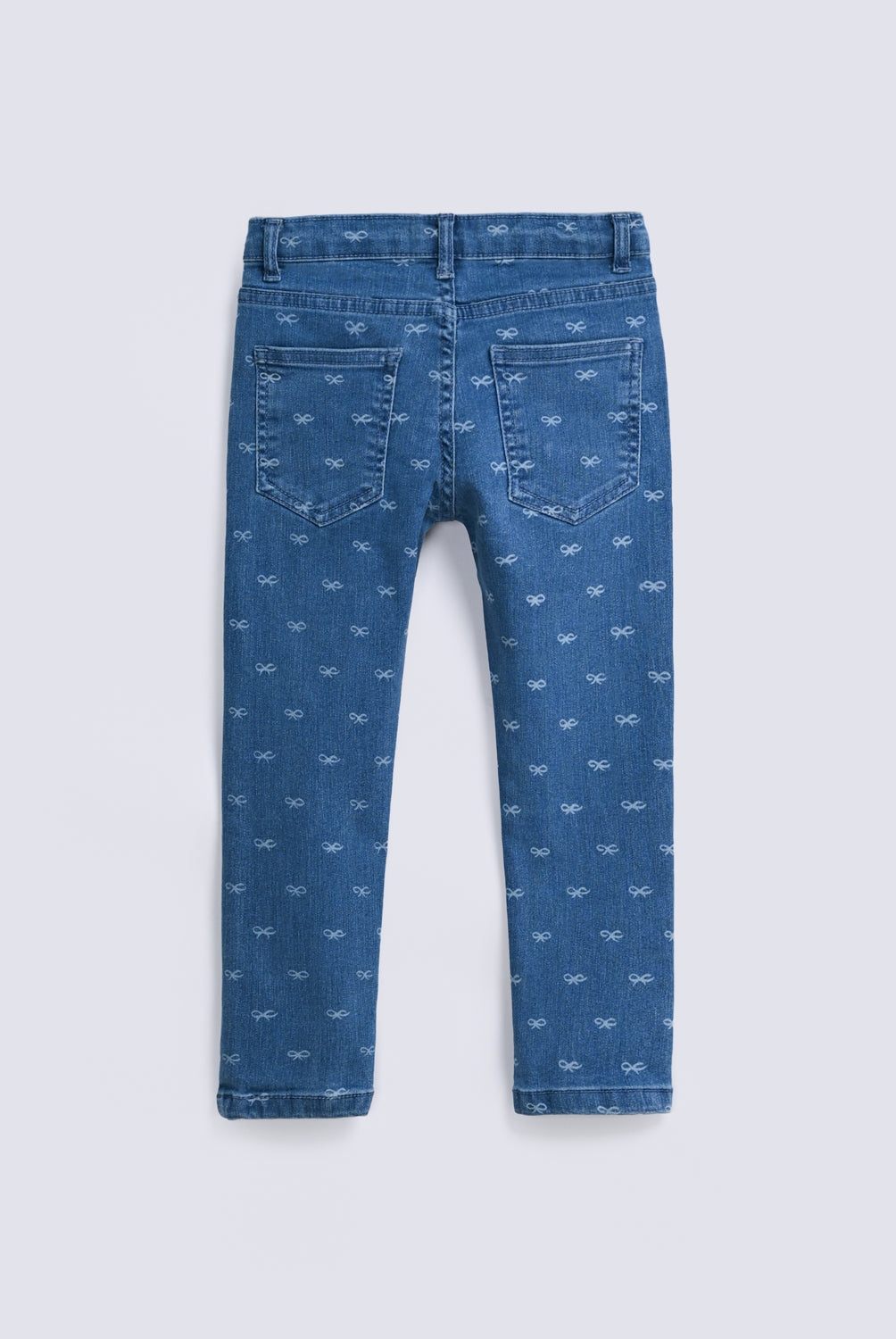 Classic blue skinny denim covered in tiny light blue bow prints, adding a sweet touch to a snug silhouette.