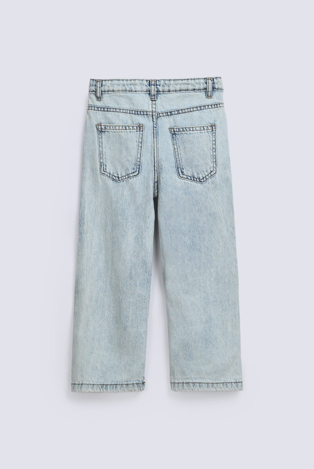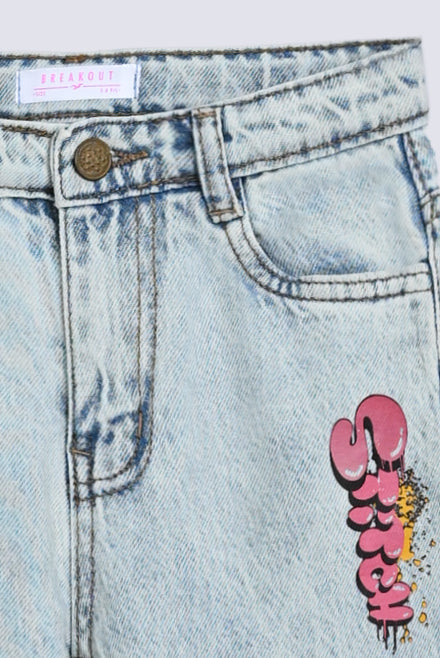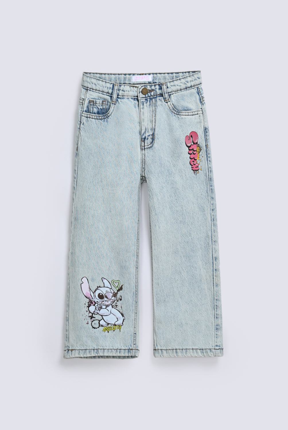 Light blue loose denim with a soft faded wash and playful Stitch prints on the front.
