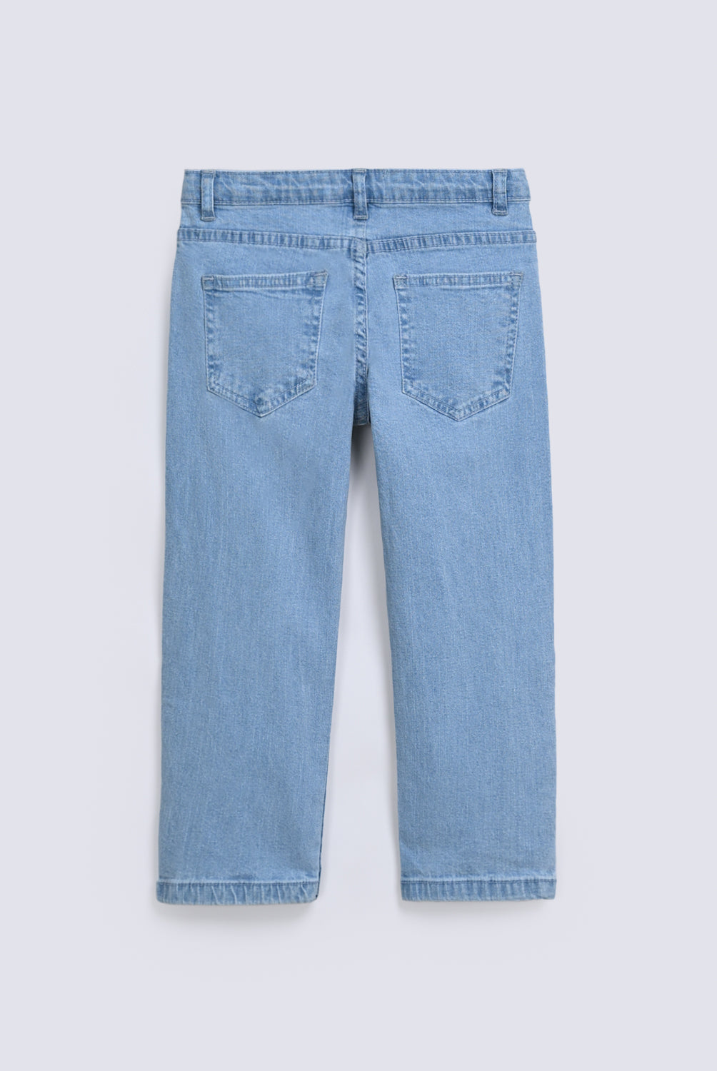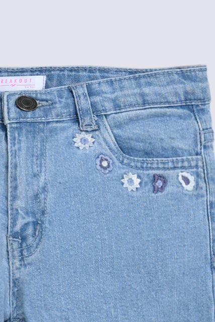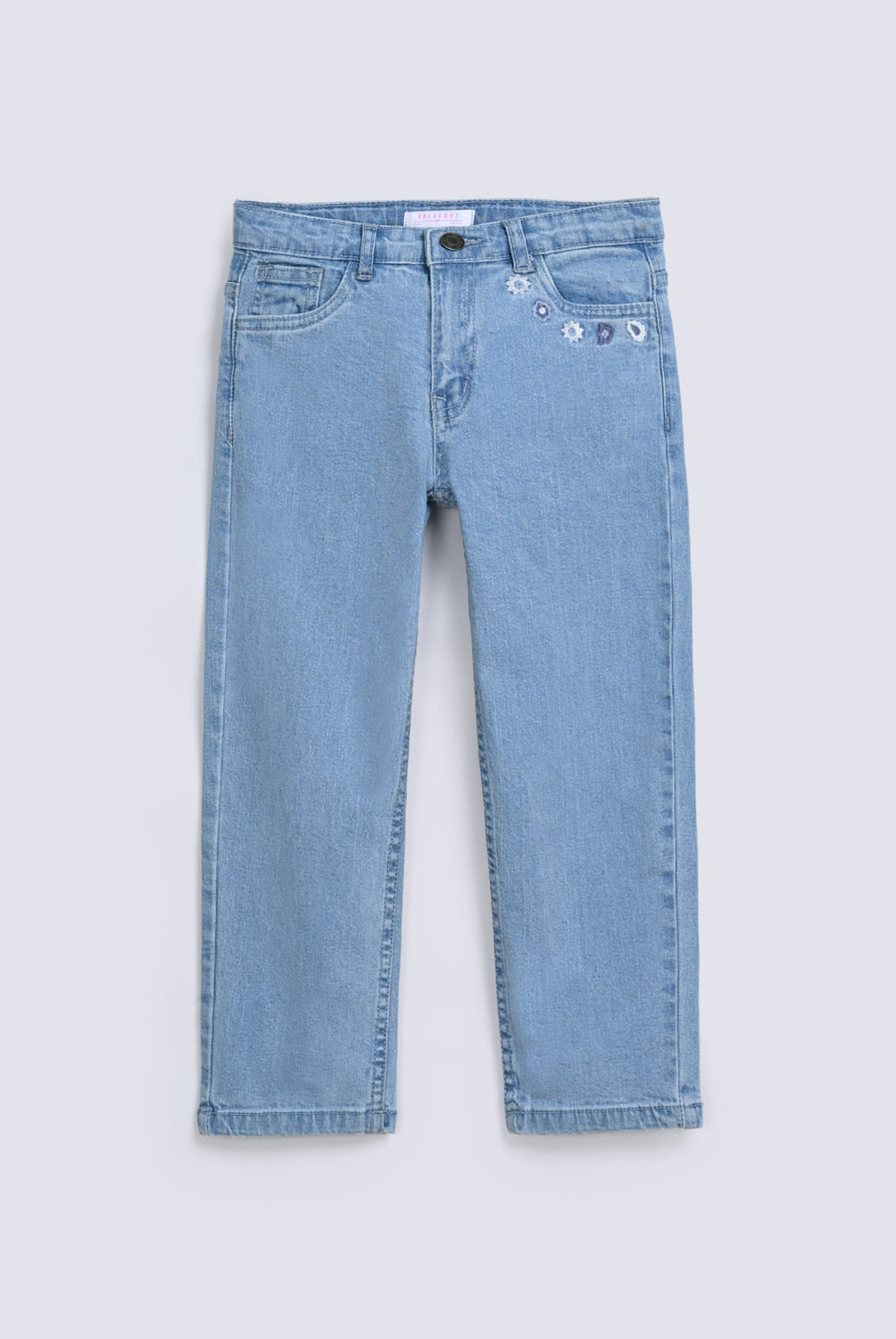 A relaxed mom fit in a soft blue wash, with just a touch of embroidery on the side pocket for a hint of detail.