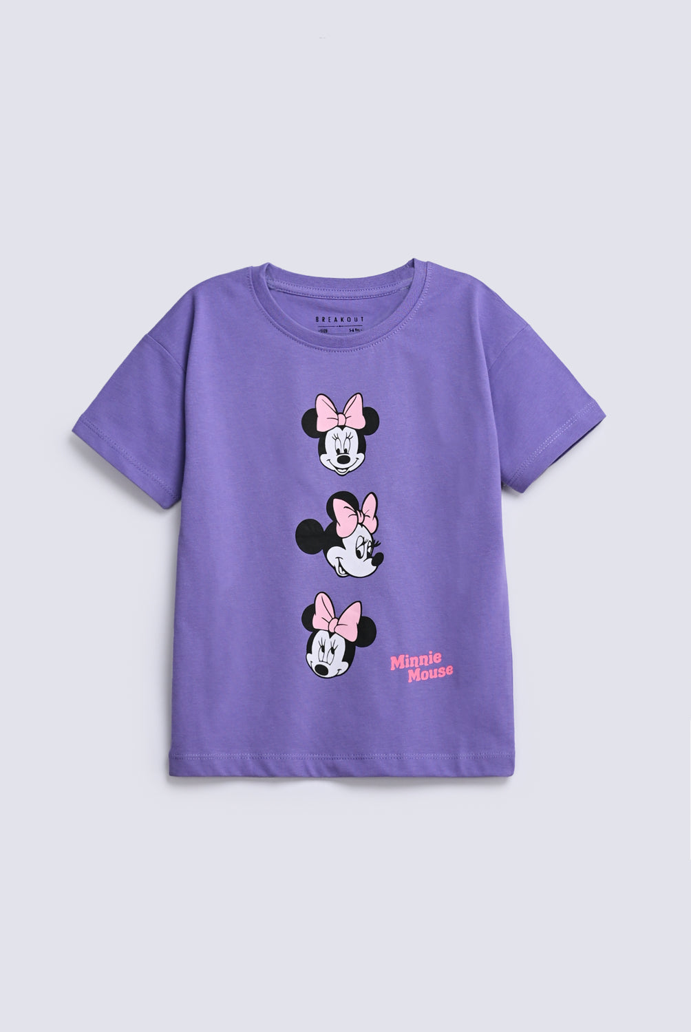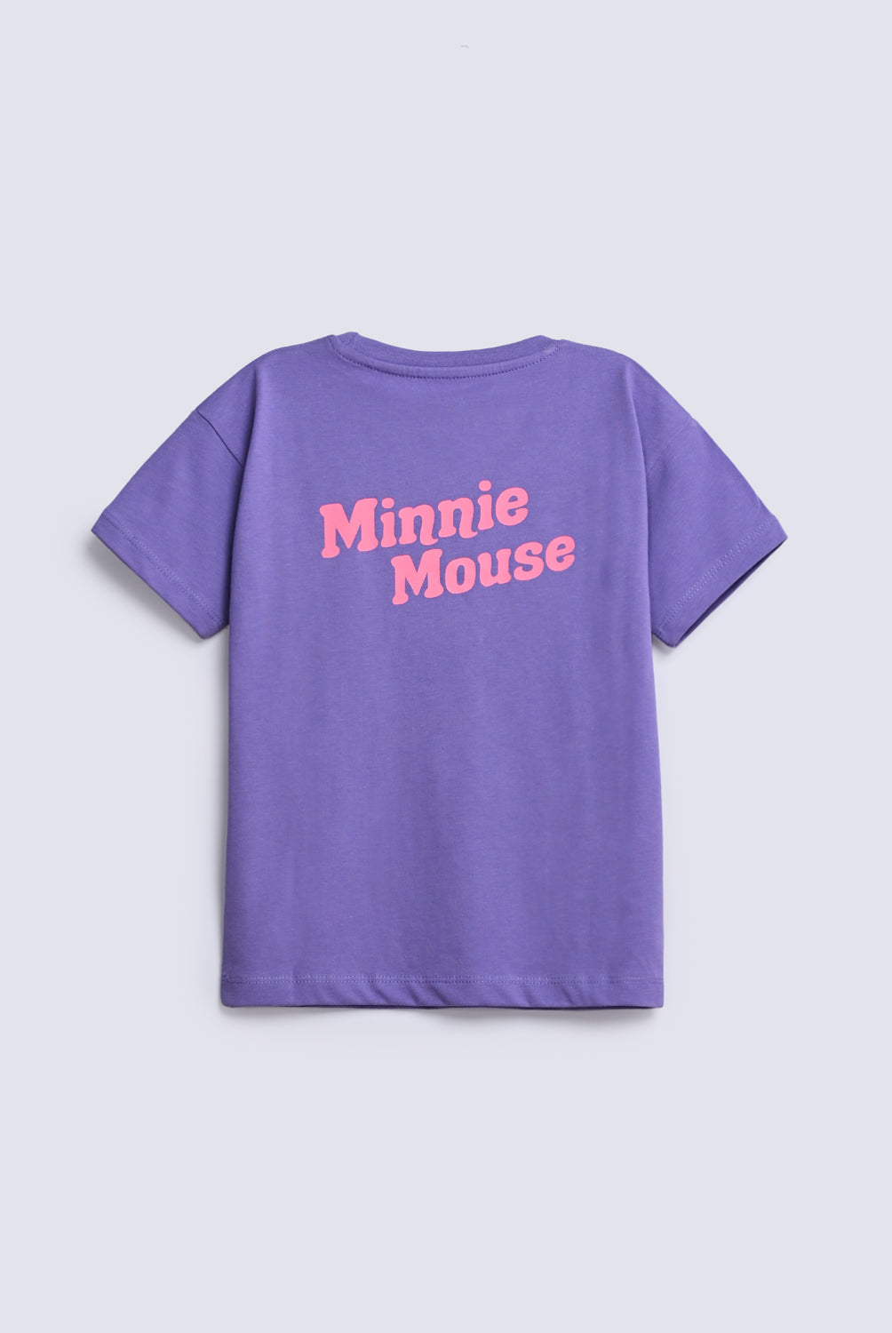 Purple cotton tee with playful Minnie Mouse prints on the front and her name splashed in pink across the back.