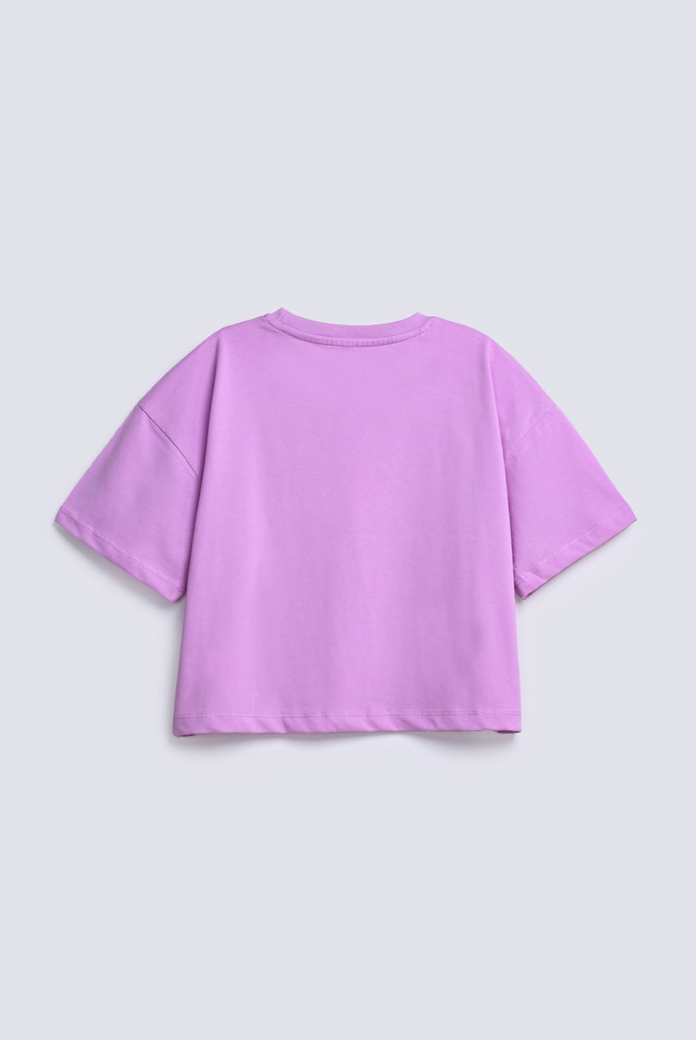 Light purple tee with a roomy boxy fit, finished with a big white bow print front and center.