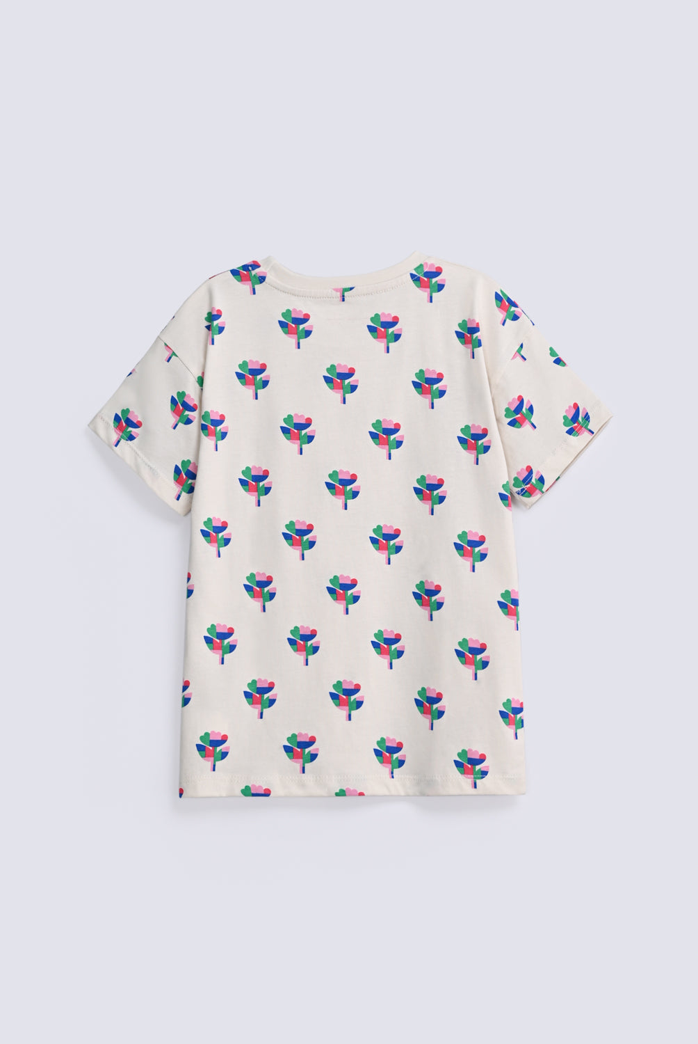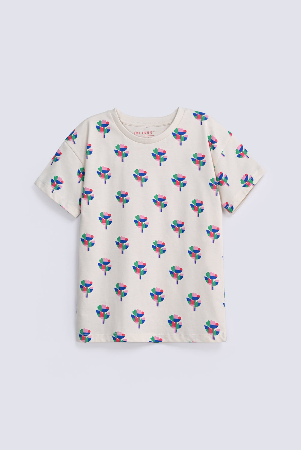 A soft ecru canvas scattered with multicolored flowers, finished with an easy drop shoulder cut.