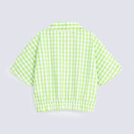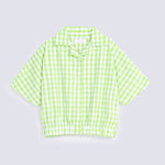 Covered in green and white checks, this short sleeves shirt features white buttons and a stretchy hem that adds a cute, gathered shape with a comfy fit.