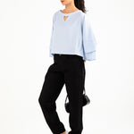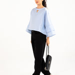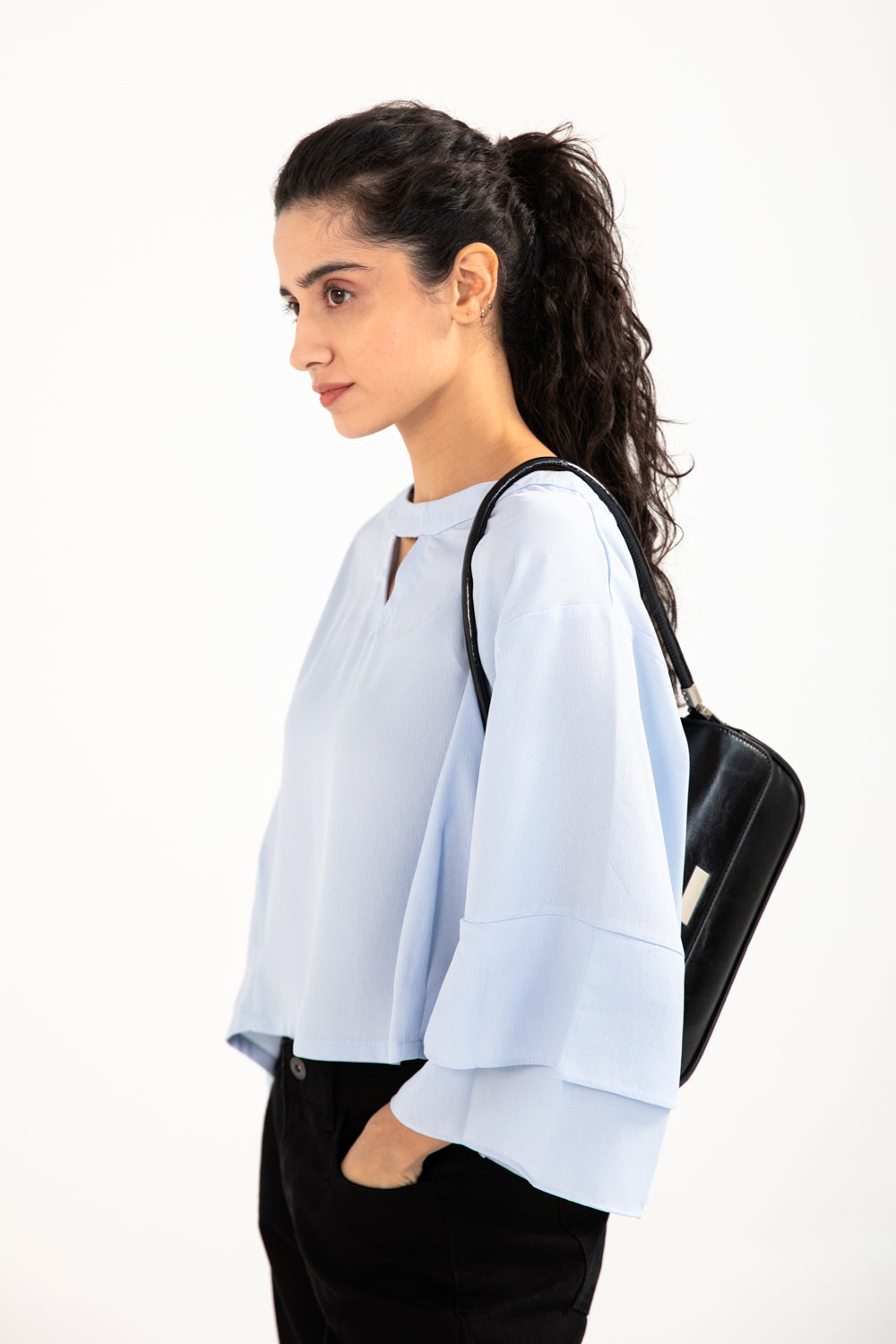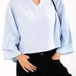 Top in soft blue crafted from a flowy synthetic blend, featuring wide layered sleeves, a keyhole neckline, and pleated detailing along the hem for added dimension.