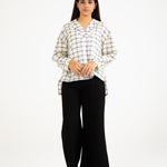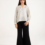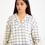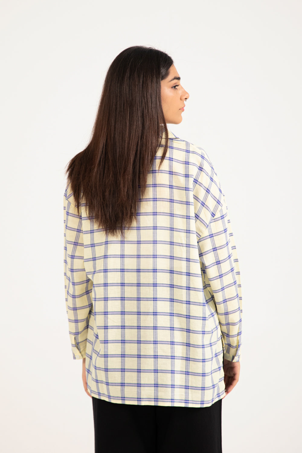 Butter yellow top with a blue checkered pattern, drop shoulder fit, collar detail, and full-length sleeves.