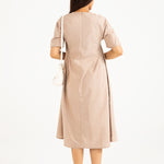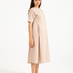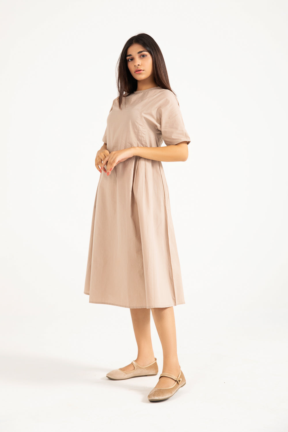 Beige cotton dress with a minimal design, featuring pleat details at the waist and a clean armhole cut.