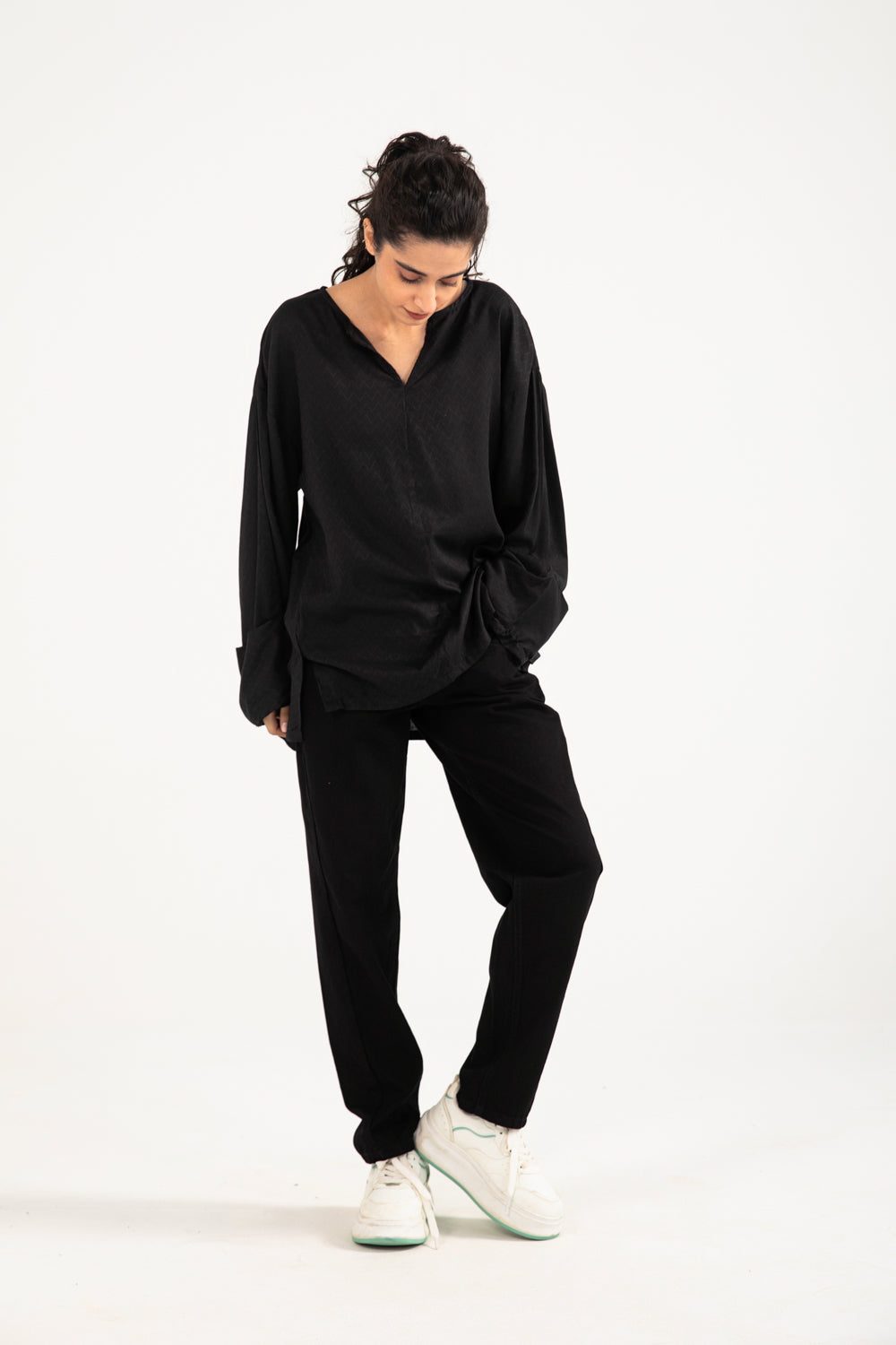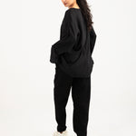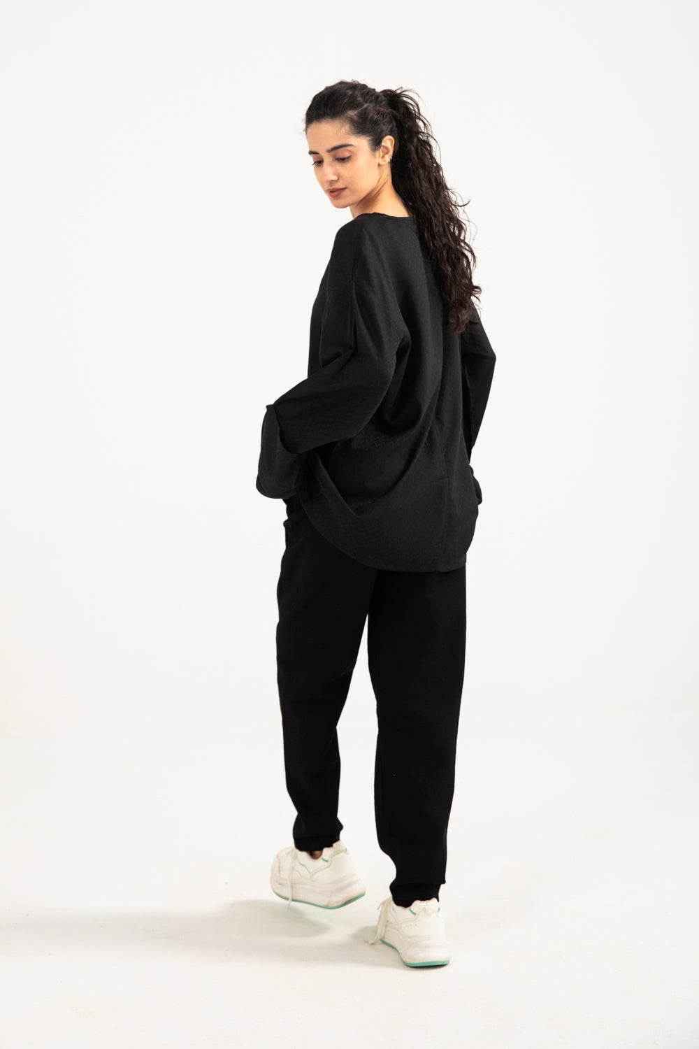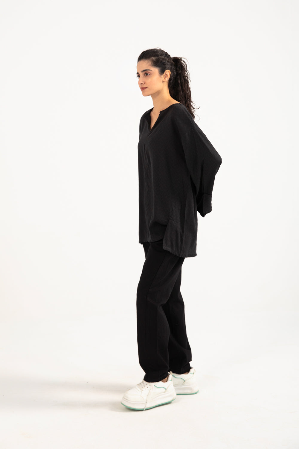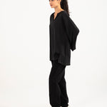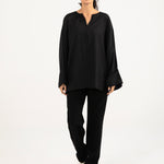 Top in black crafted from cotton with full length flowy sleeves and subtle side seam detailing with a clean finish.