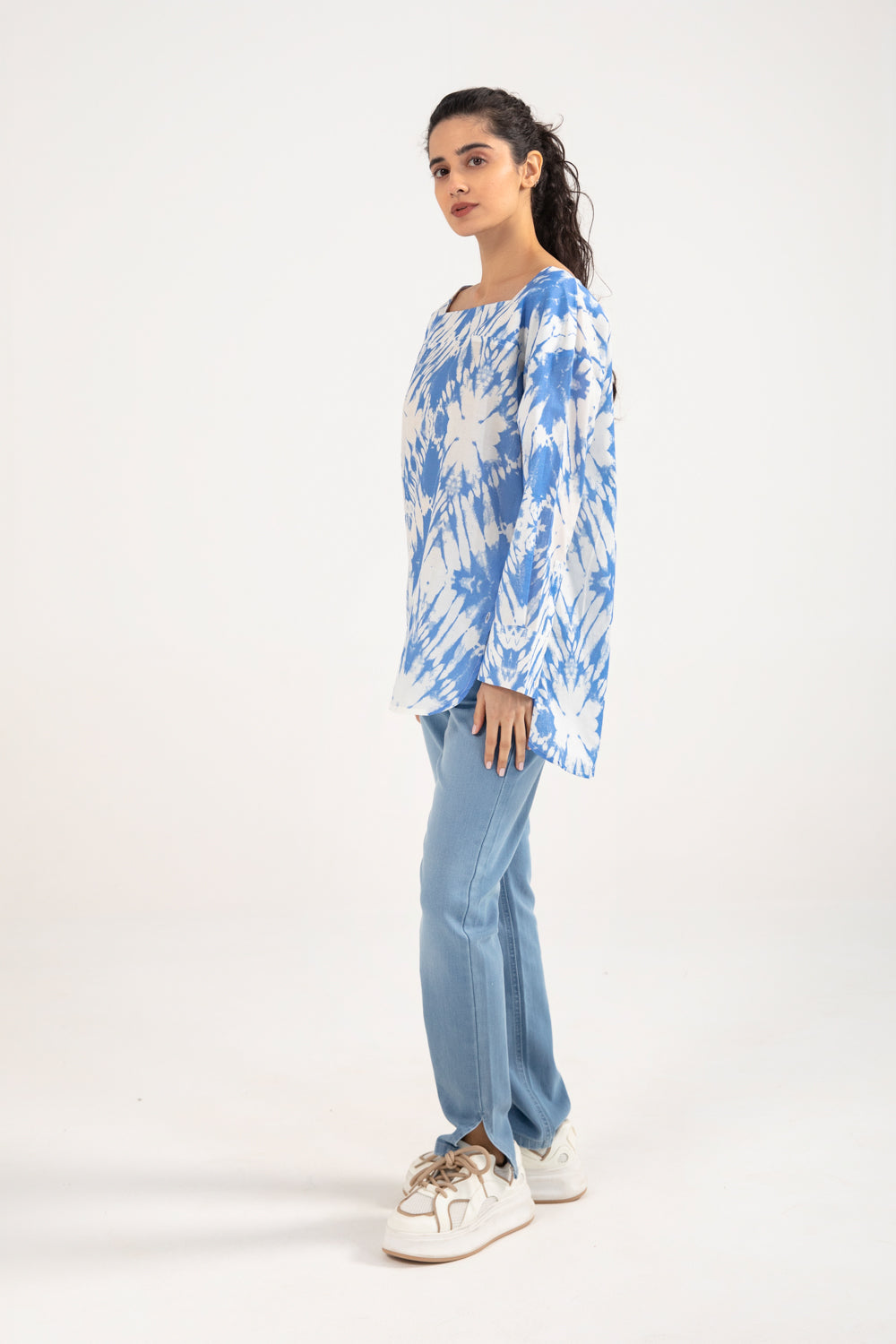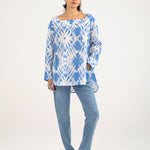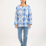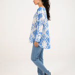 Printed top in blue and white made from cotton with an all over design and full length sleeves.