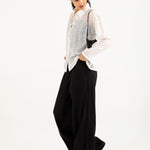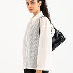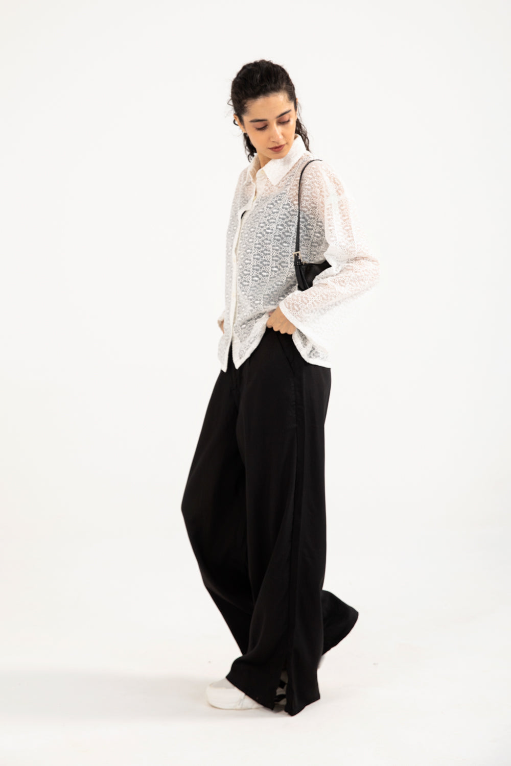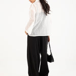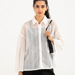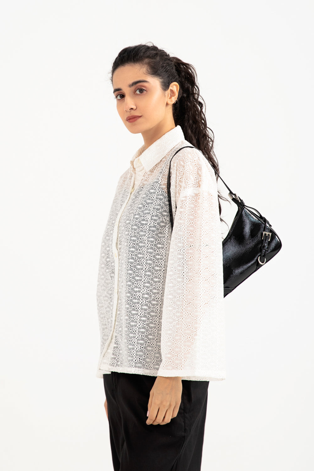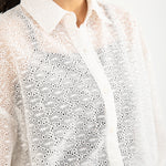All over embroidered top in white made from a semi sheer synthetic blend with drop shoulders and a button down front for an airy, delicate feel.