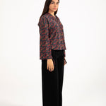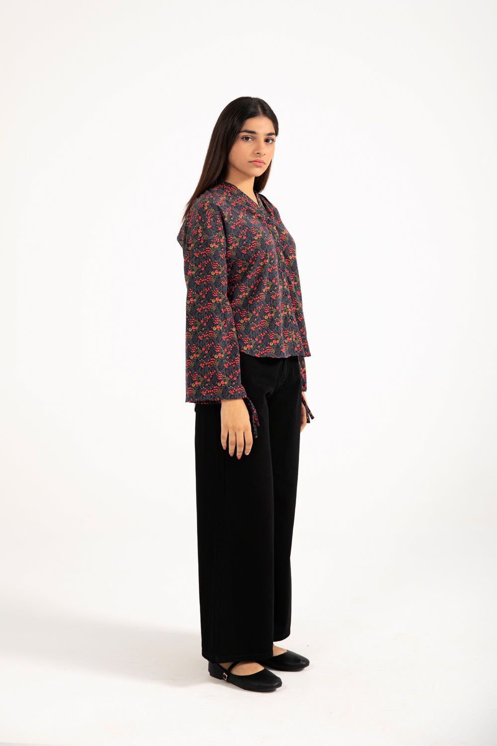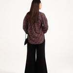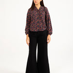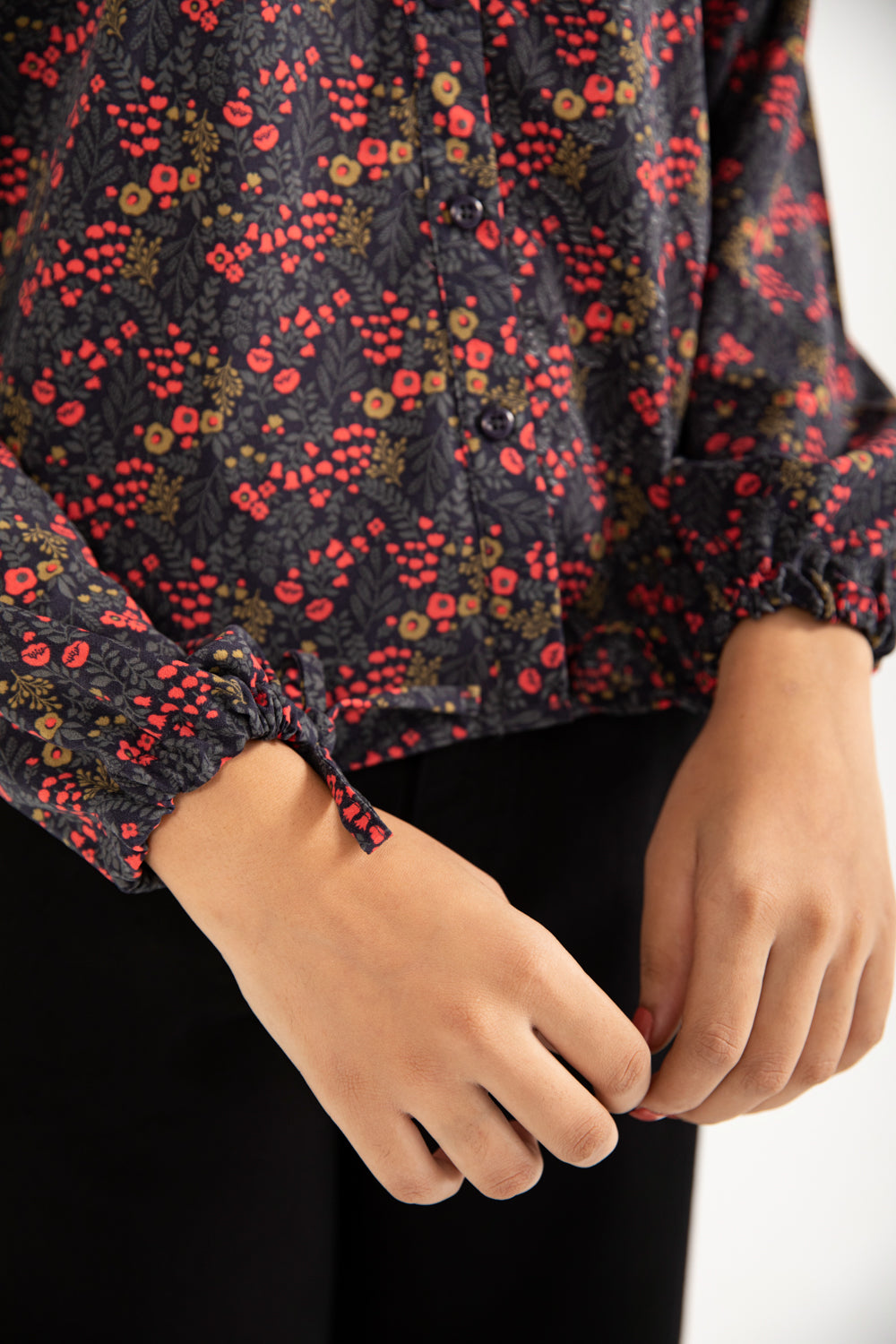 Multi-colored floral print top with full-length sleeves featuring tie accents and elastic cuffs, finished with matching buttons and a shaped hem detail.