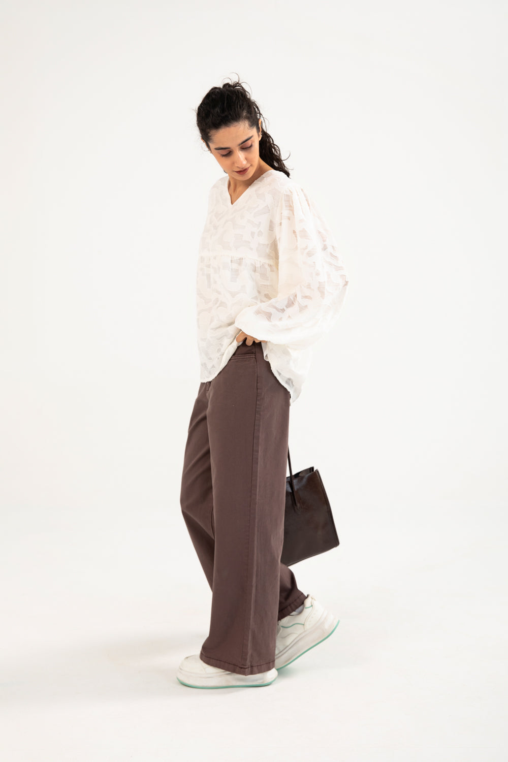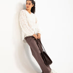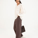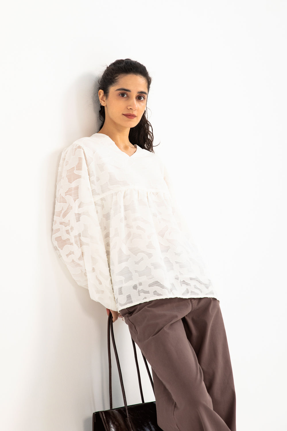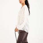 Jacquard peplum top in off white made from a semi sheer cotton blend, featuring a V neckline and cuffed balloon sleeves for a soft, elegant shape.