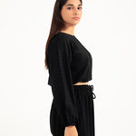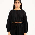 Black blouse in a cotton synthetic blend with a textured horizontal line finish, featuring a cropped elasticated waist with a front tie detail and full-length sleeves with elastic cuffs.
