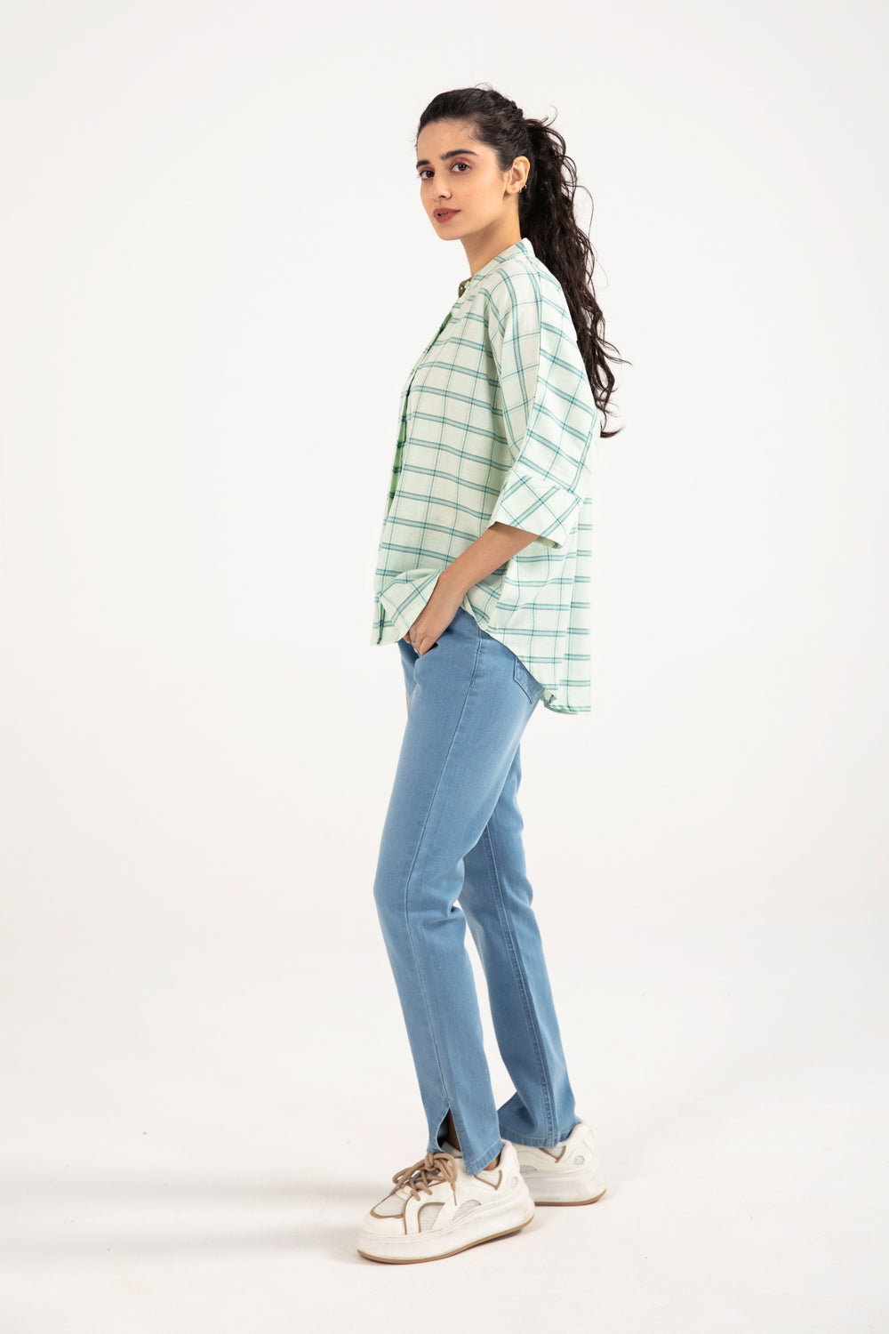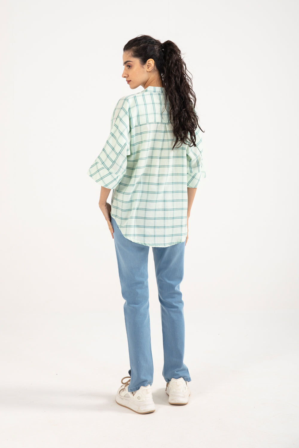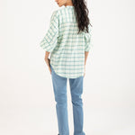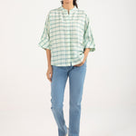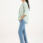 Textured kimono top in pastel green crafted from cotton with a soft checkered design for a relaxed look.