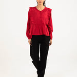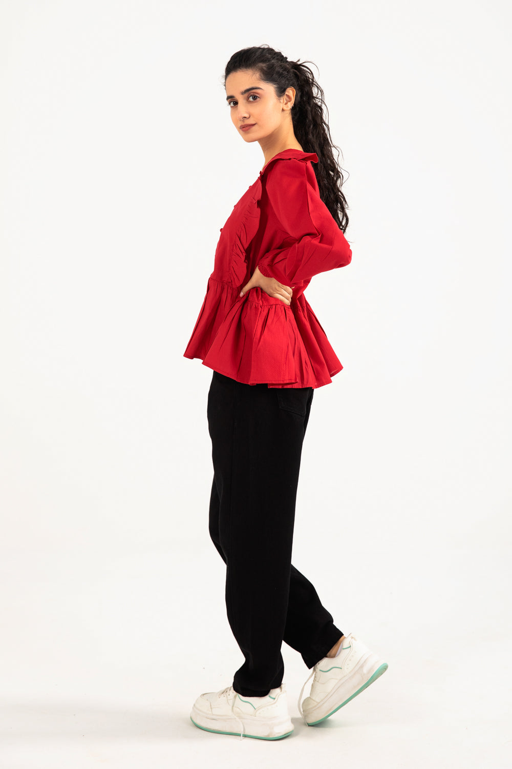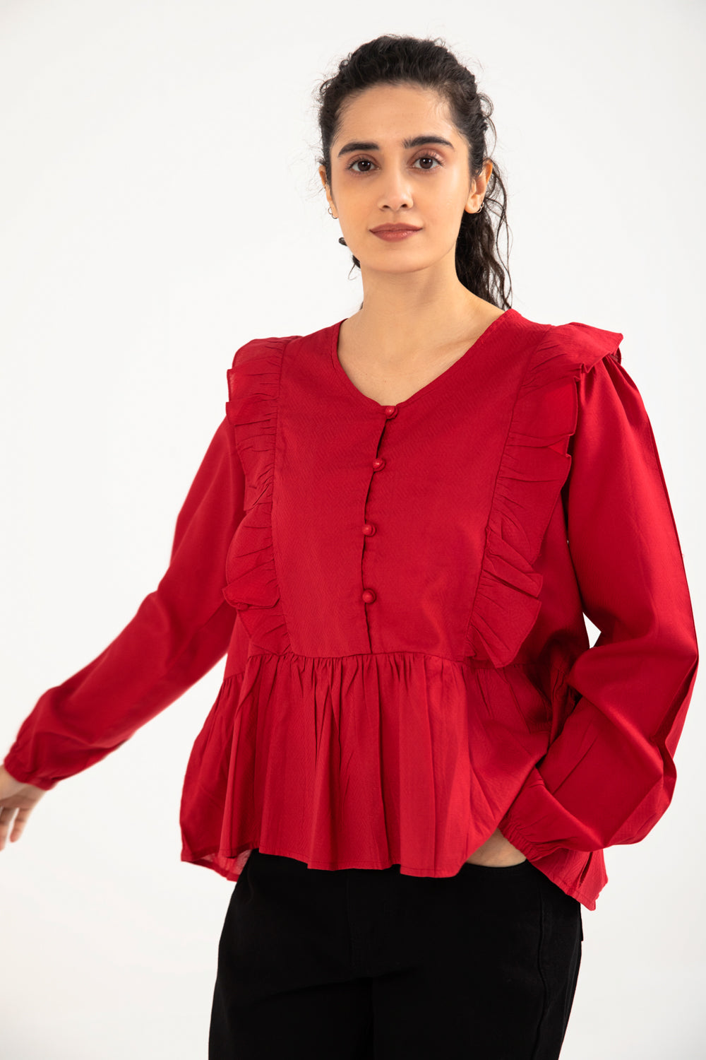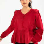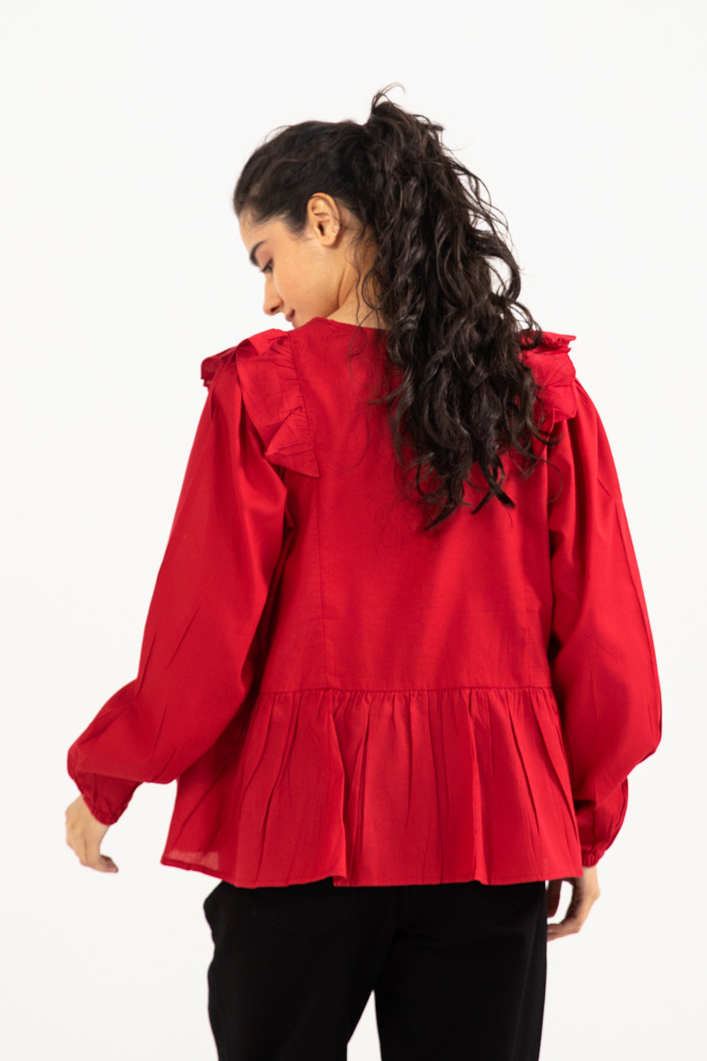 Ruffled peplum top in red crafted from a cotton blend with front buttons and full length cuffed sleeves.