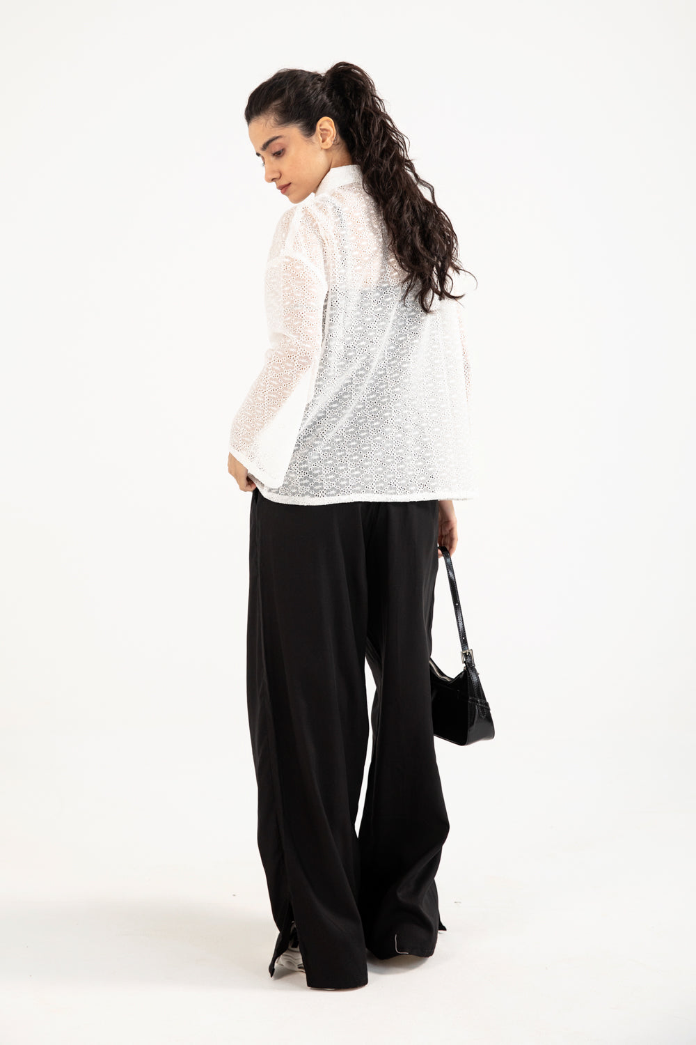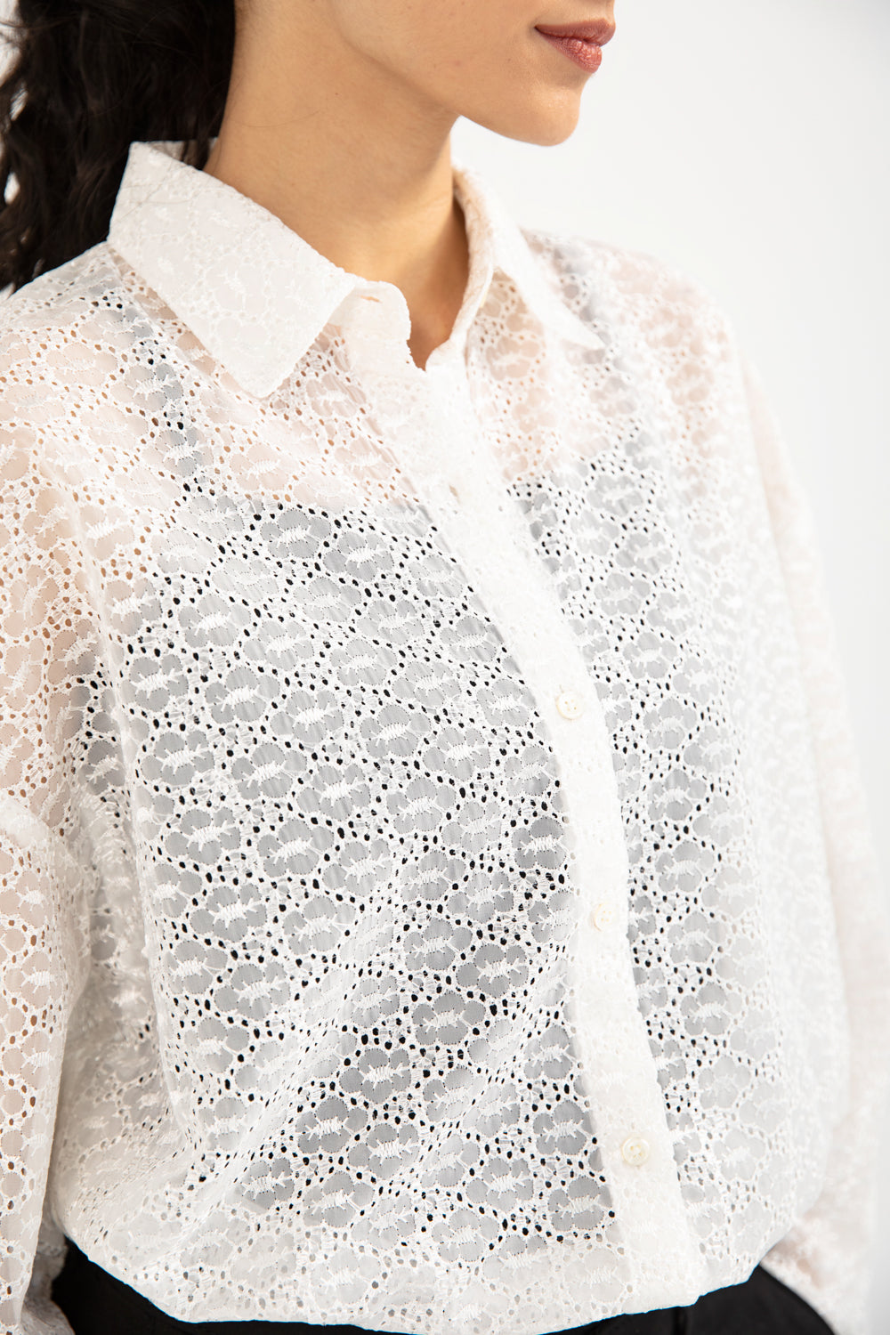 All over embroidered top in white made from a semi sheer synthetic blend with drop shoulders and a button down front for an airy, delicate feel.