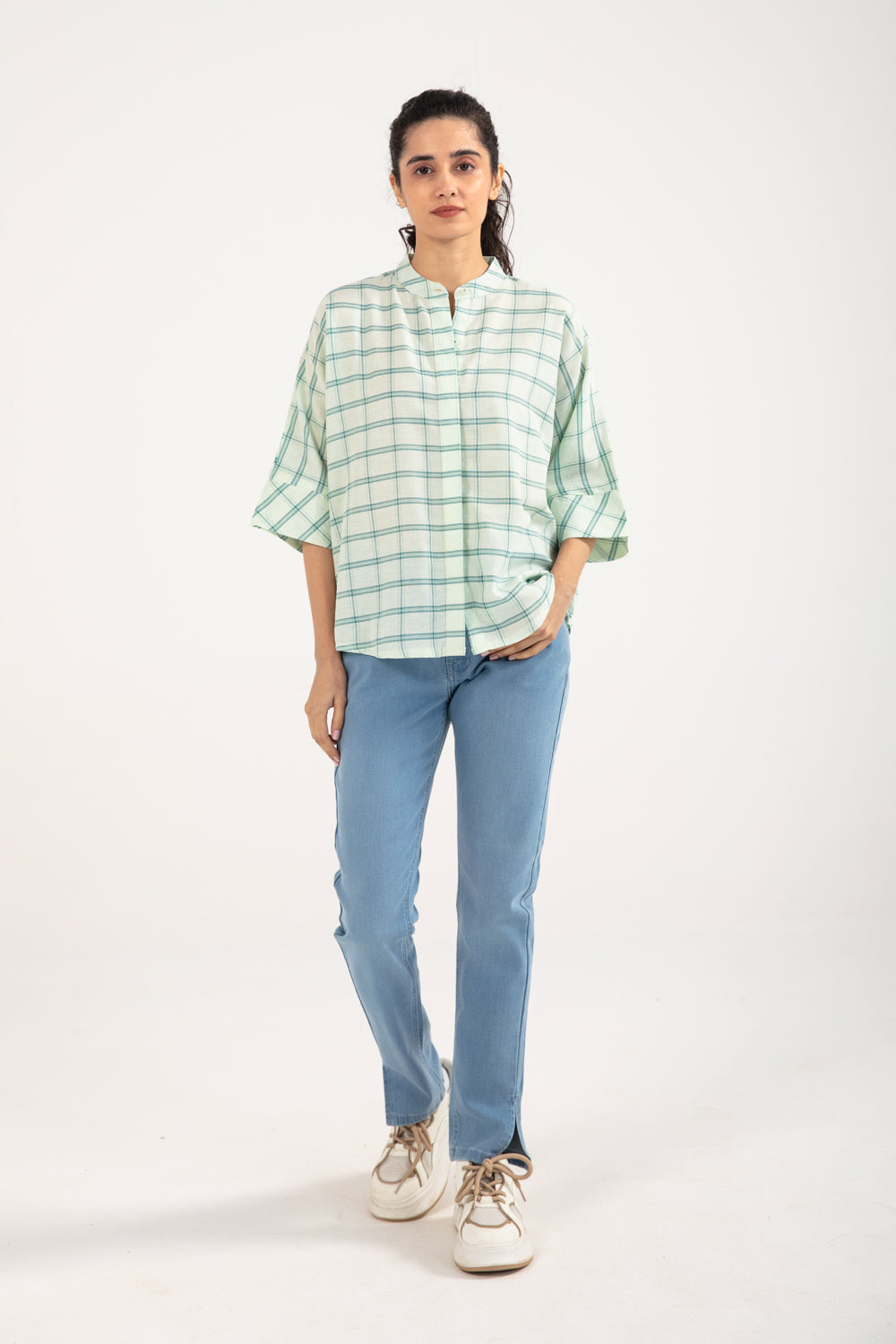 Textured kimono top in pastel green crafted from cotton with a soft checkered design for a relaxed look.