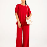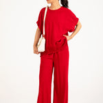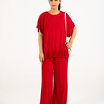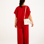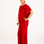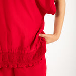 Red top with short kimono sleeves, a smocked front hem, and a back hem slit.