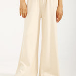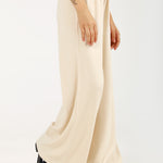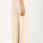 Beige wide leg trousers featuring drawcords at the waist for an adjustable fit.