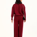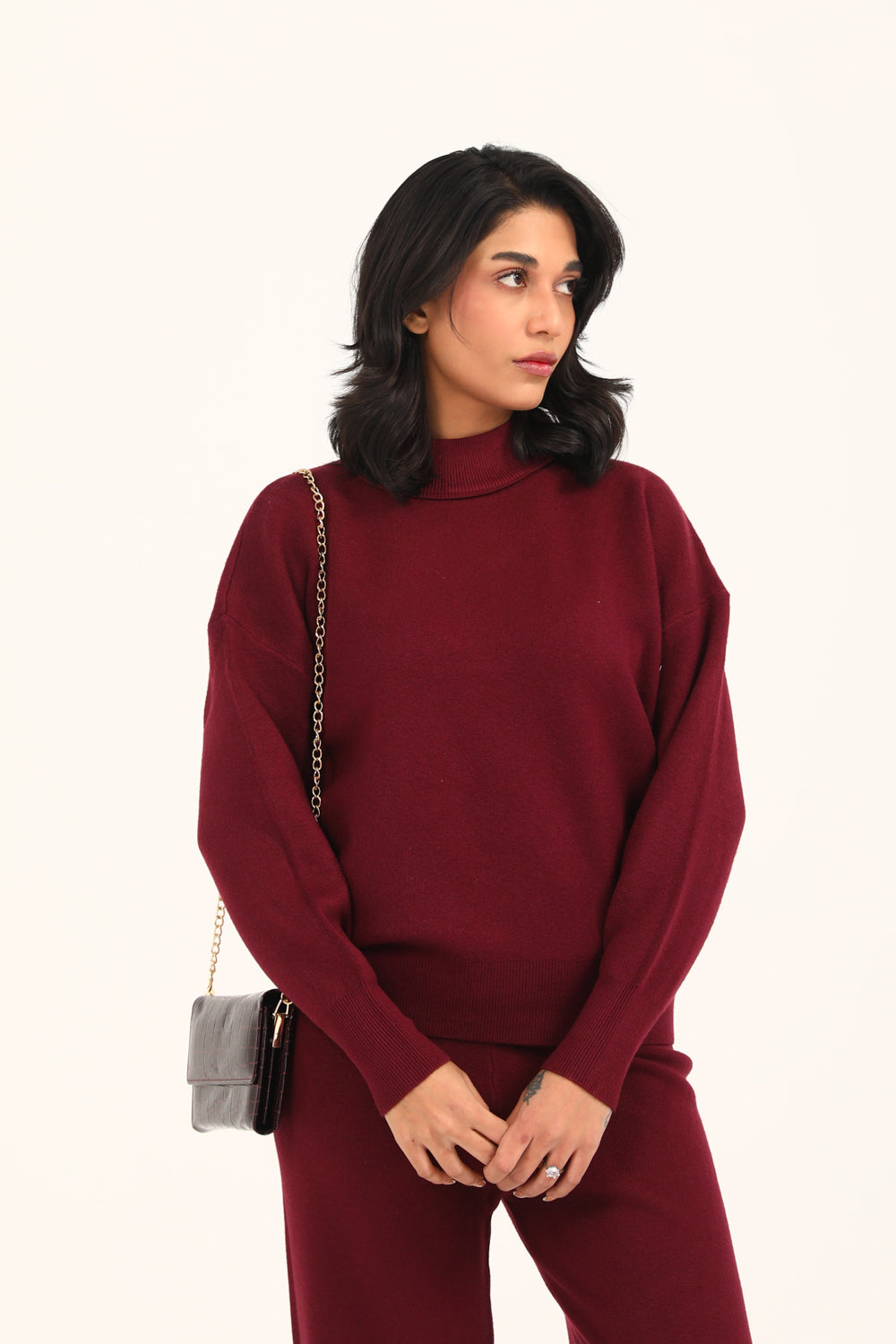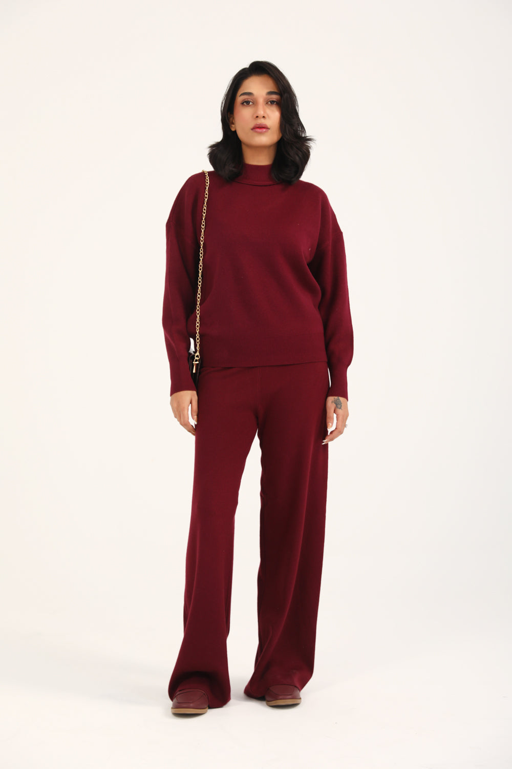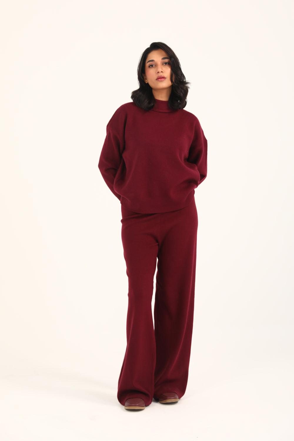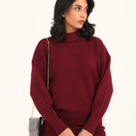 A burgundy mock neck jumper with a cashmere handfeel and oversized sleeves that create a relaxed, refined silhouette.