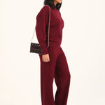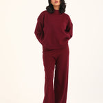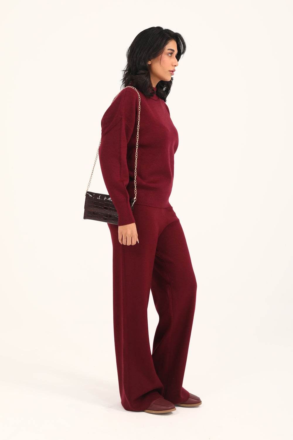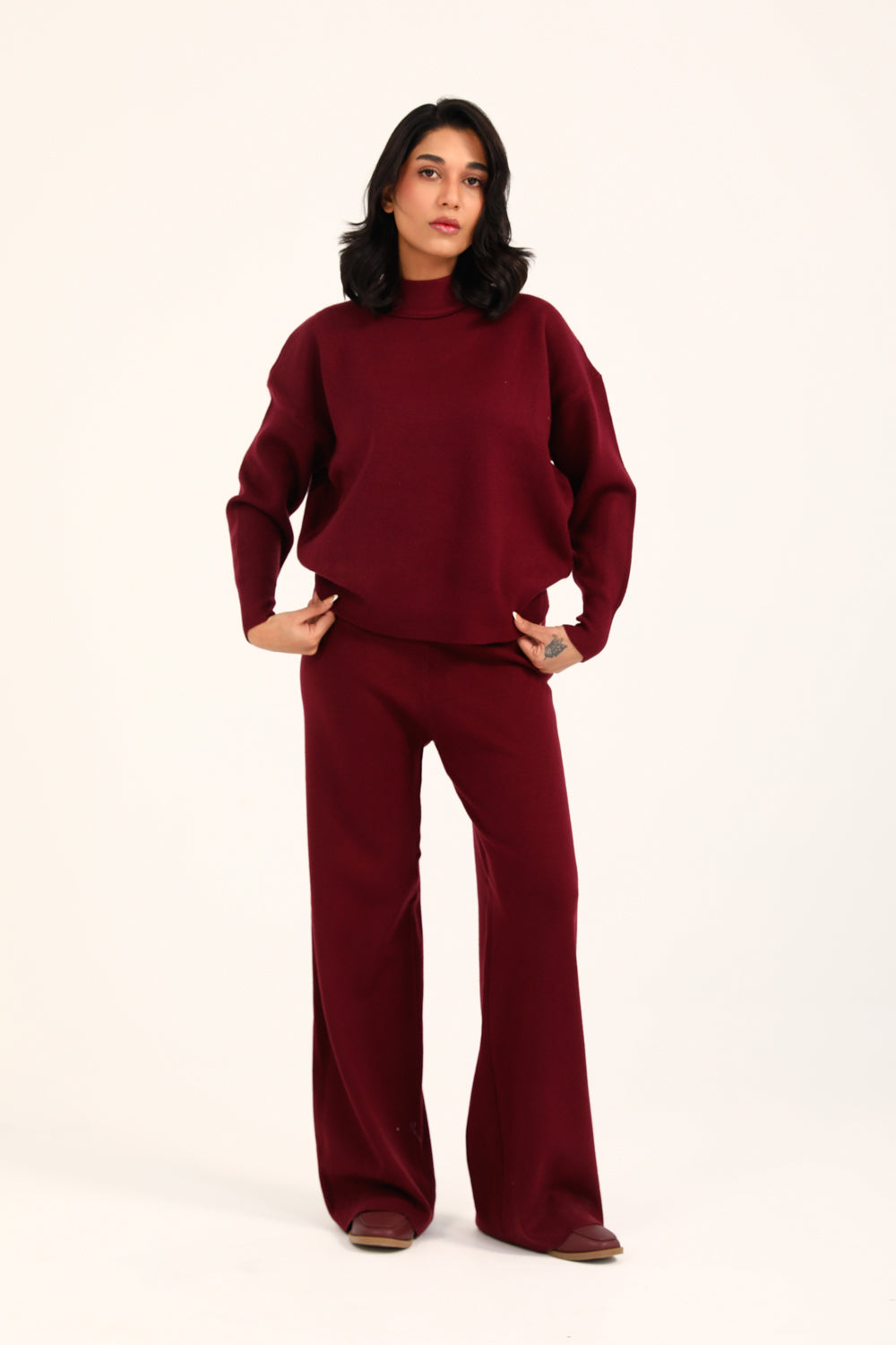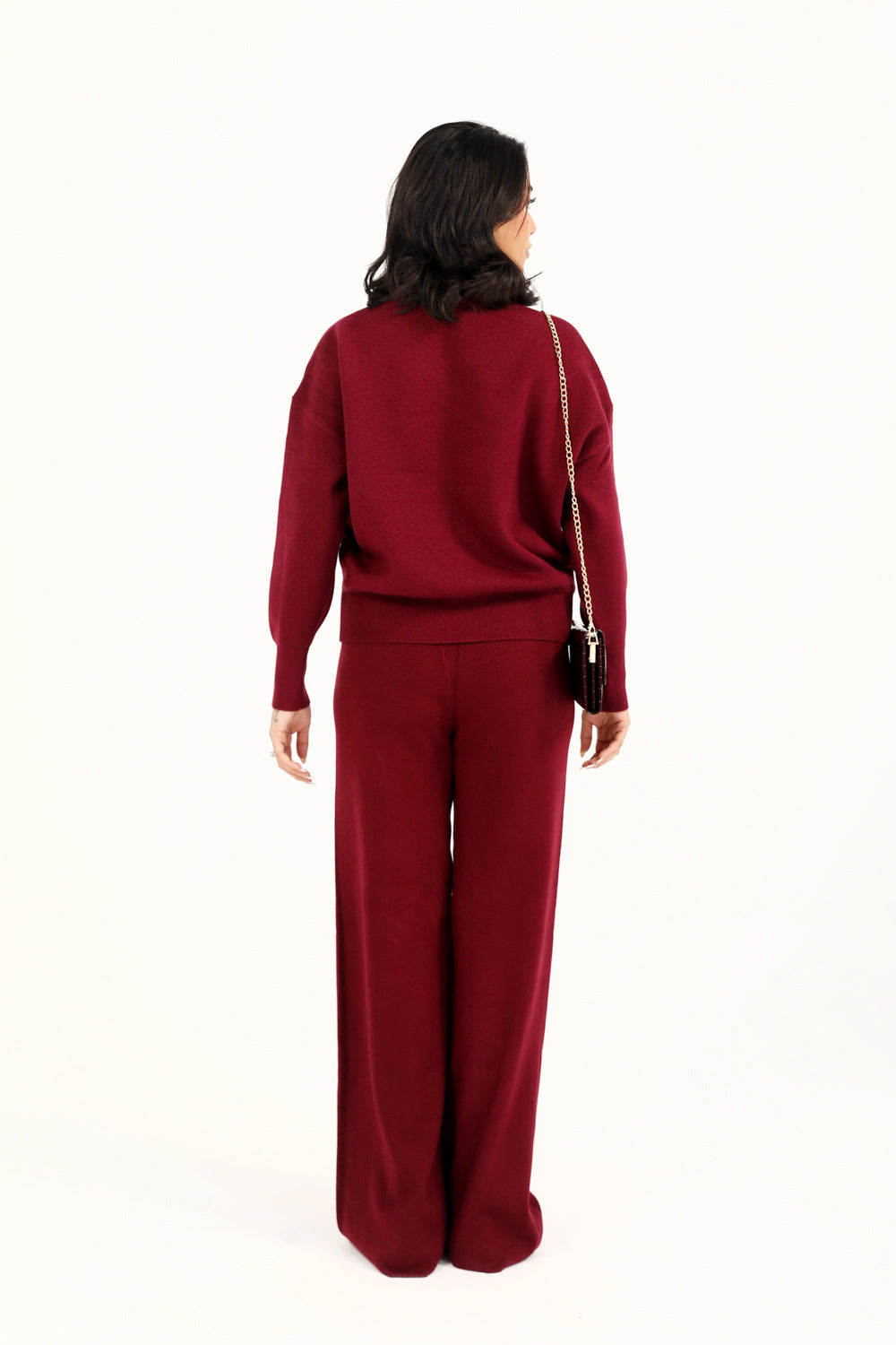 A burgundy mock neck jumper with a cashmere handfeel and oversized sleeves that create a relaxed, refined silhouette.