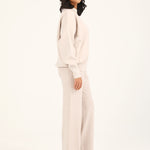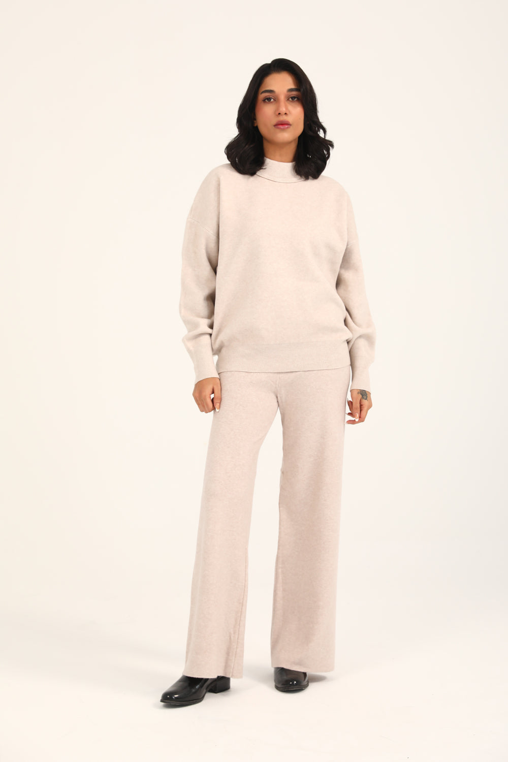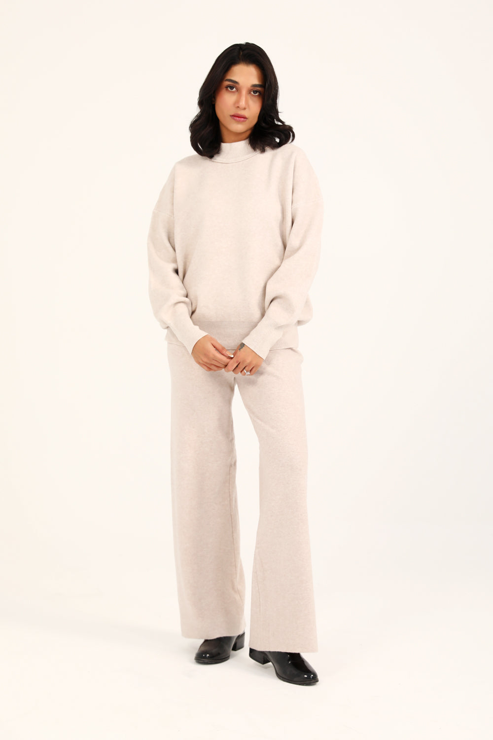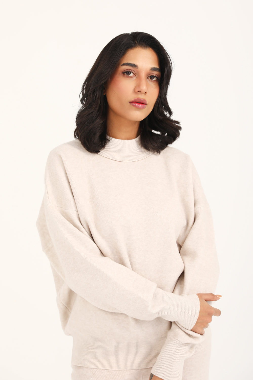 A taupe mock neck jumper with a cashmere handfeel and oversized sleeves that create a relaxed, refined silhouette.