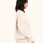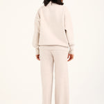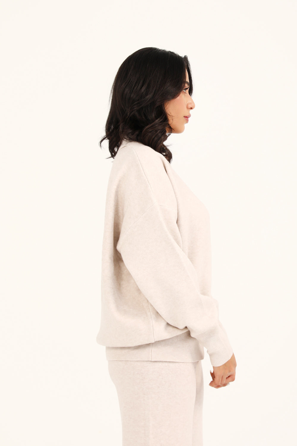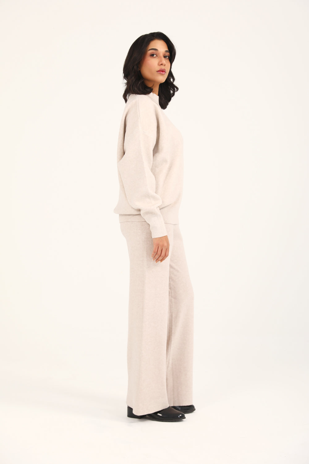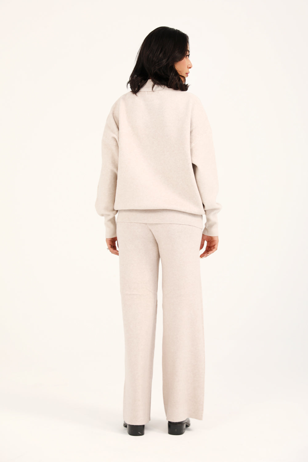 A taupe mock neck jumper with a cashmere handfeel and oversized sleeves that create a relaxed, refined silhouette.
