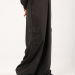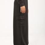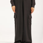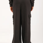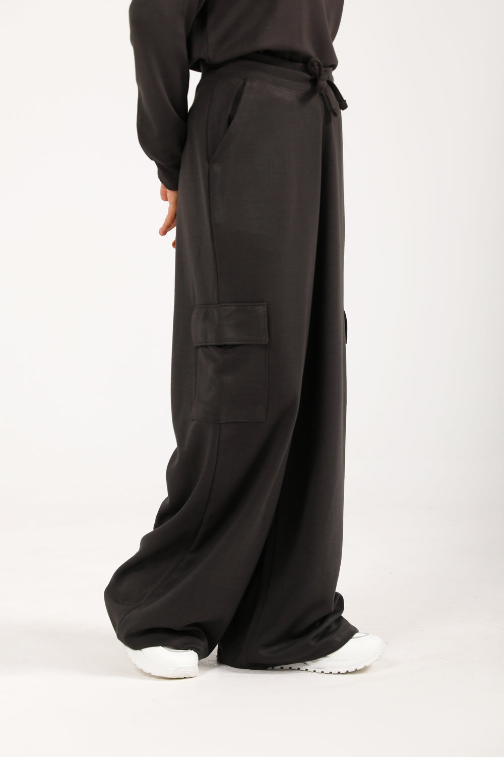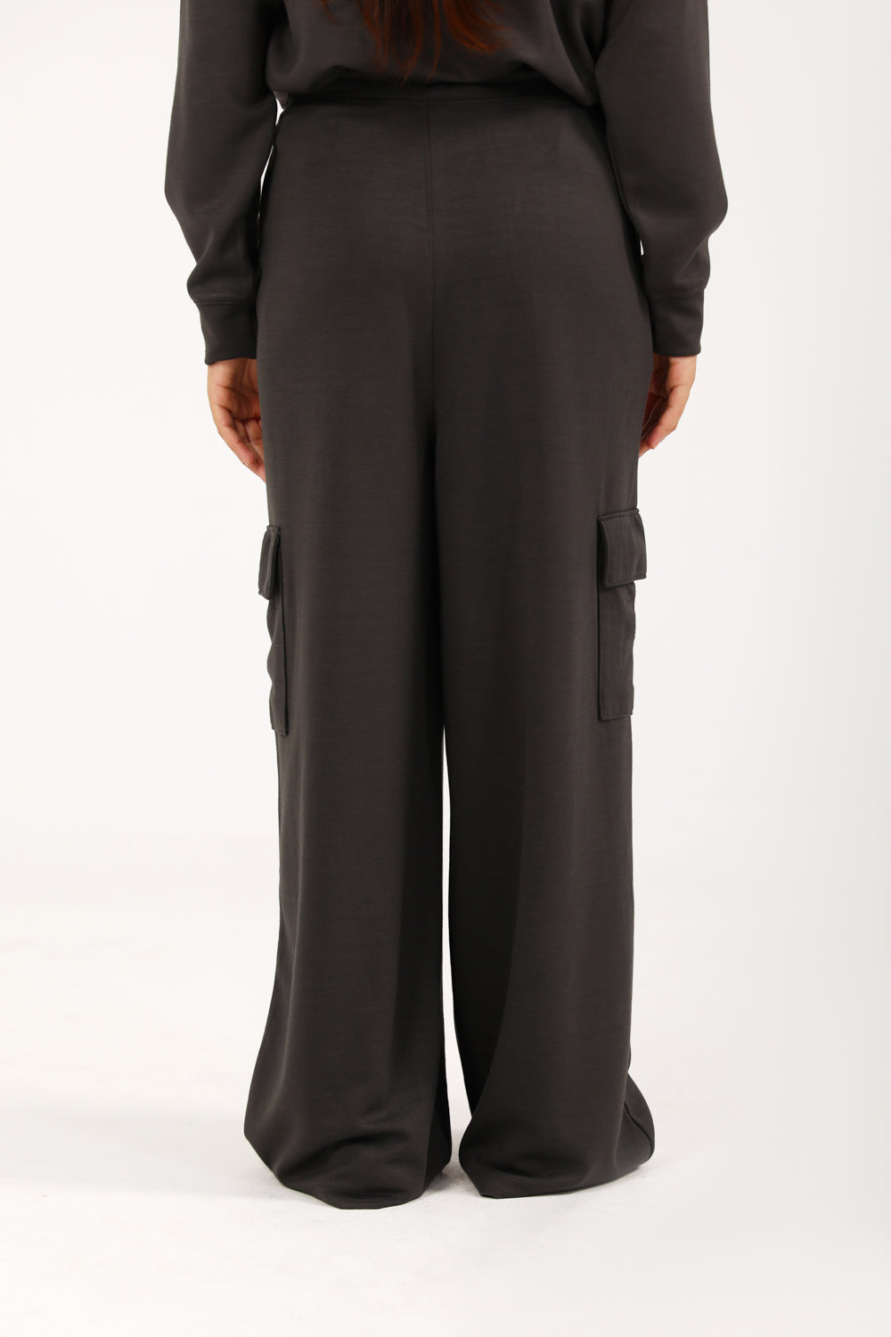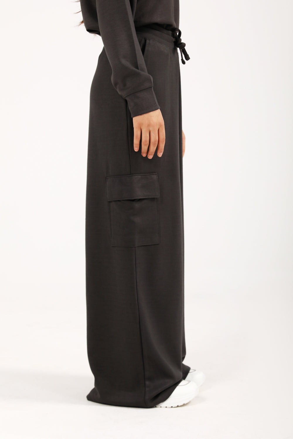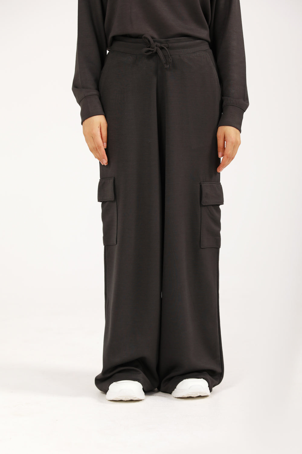 Warm grey cargo trousers in a soft synthetic blend, featuring a drawstring waistband and roomy pockets.