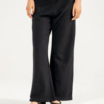 Black cotton trousers featuring a lightly textured finish and a relaxed wide leg cut, complete with an elasticated drawstring waistband for comfort.