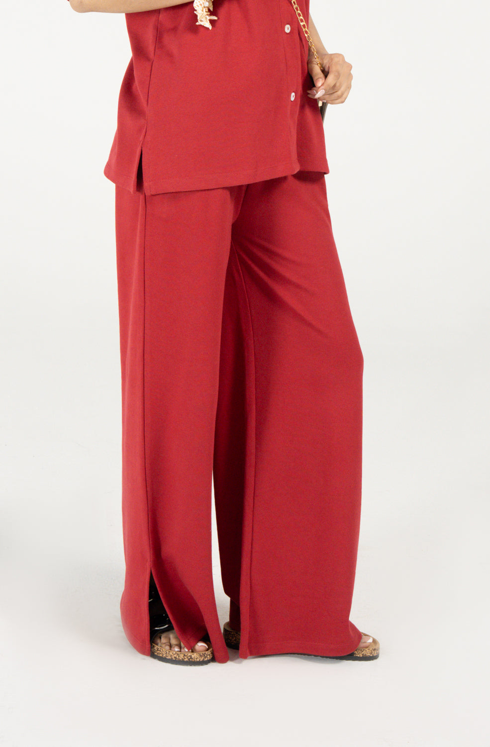 Red wide-leg trousers with an elasticated drawstring waist, swaying drape and side slits. 100% Cotton