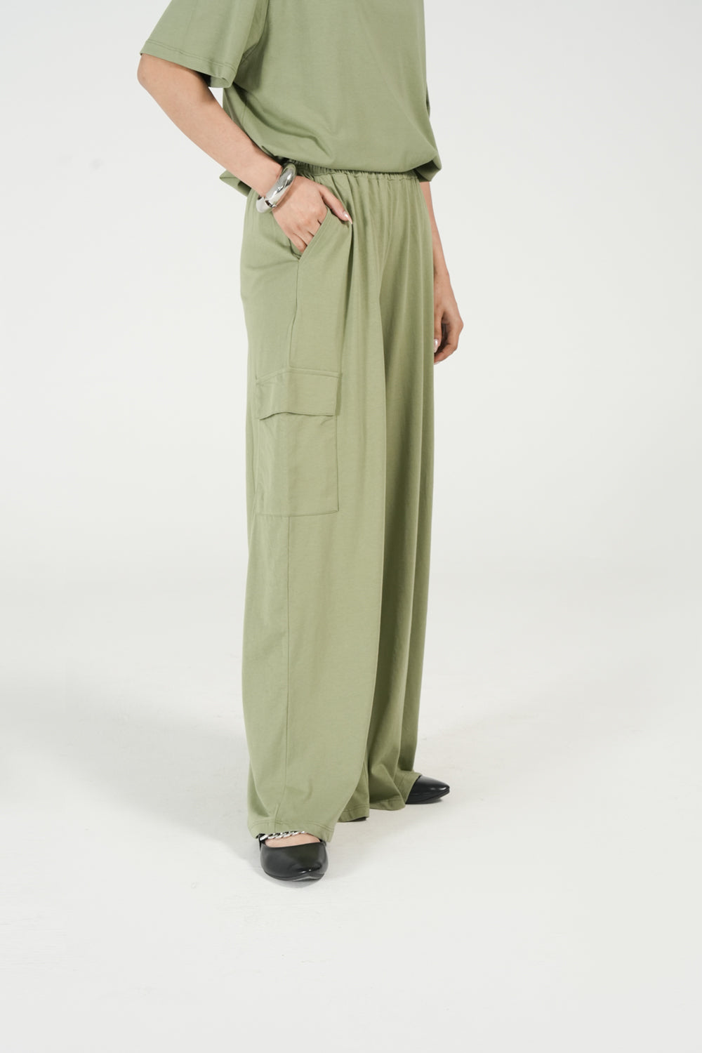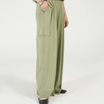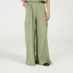Flowy Sage Green cargo trousers with a relaxed wide-leg cut finished with utility pockets.
