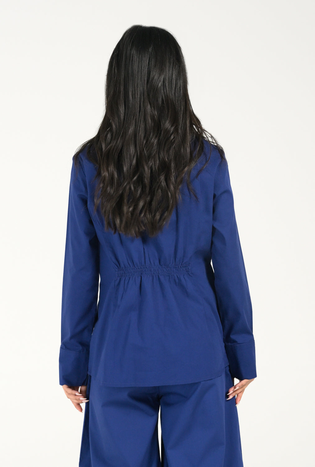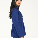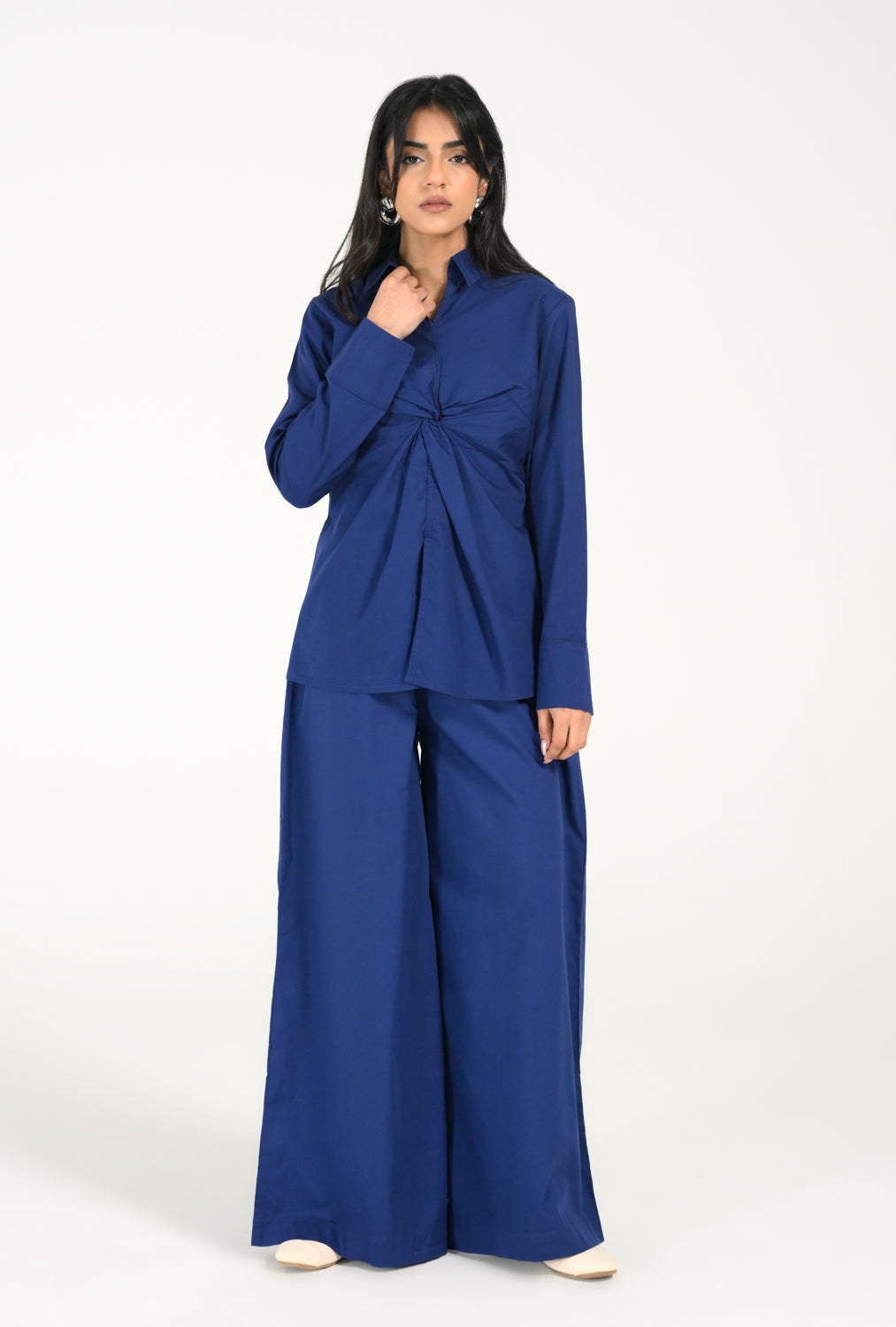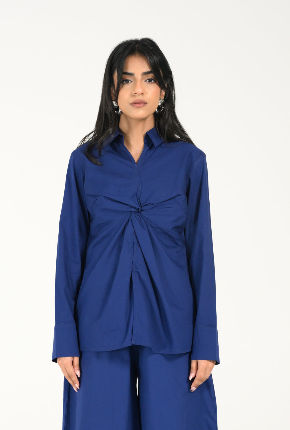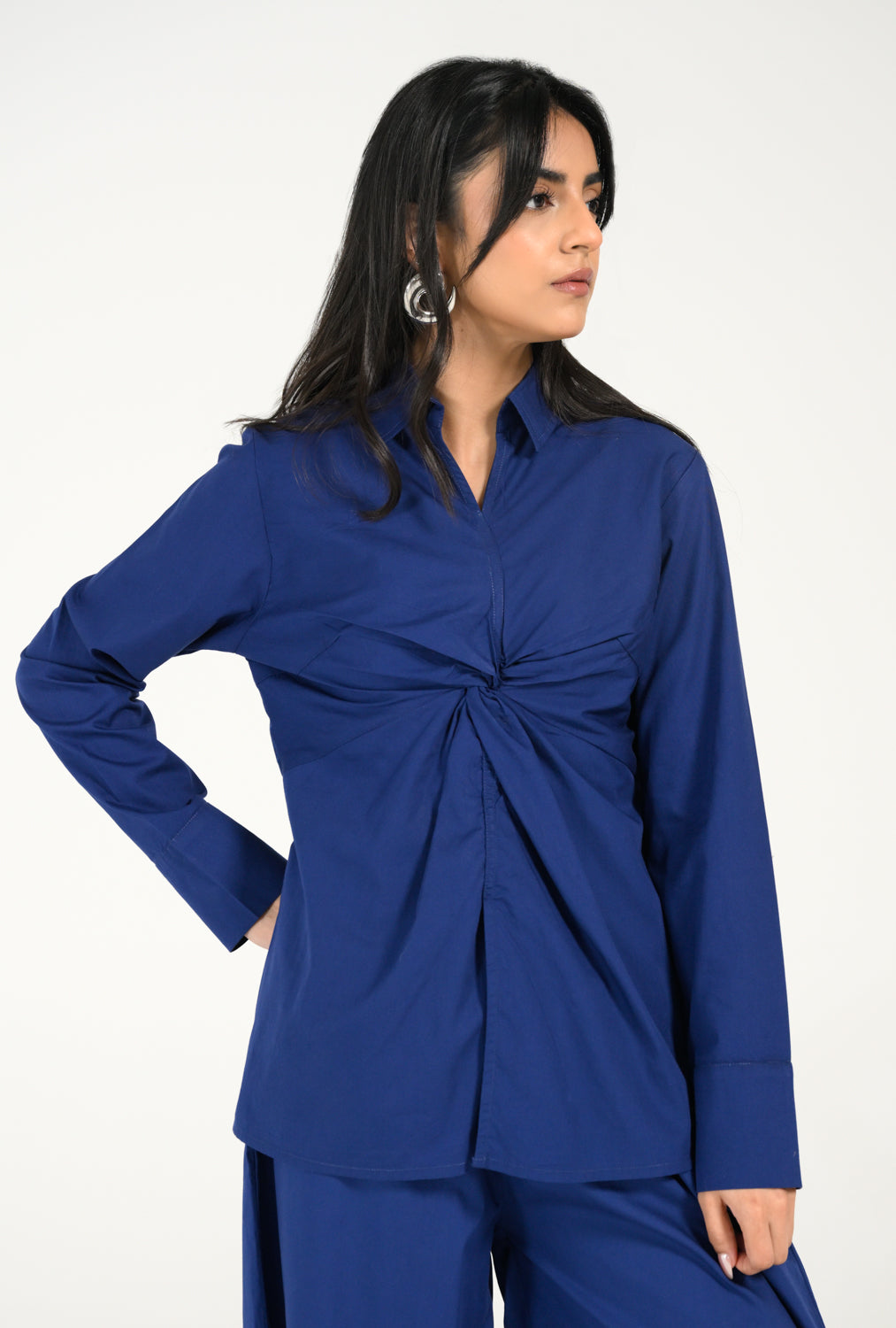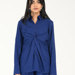 Statement Cobalt Blue shirt with a front twist detail and full sleeves, blending clean tailoring with a structured silhouette.
