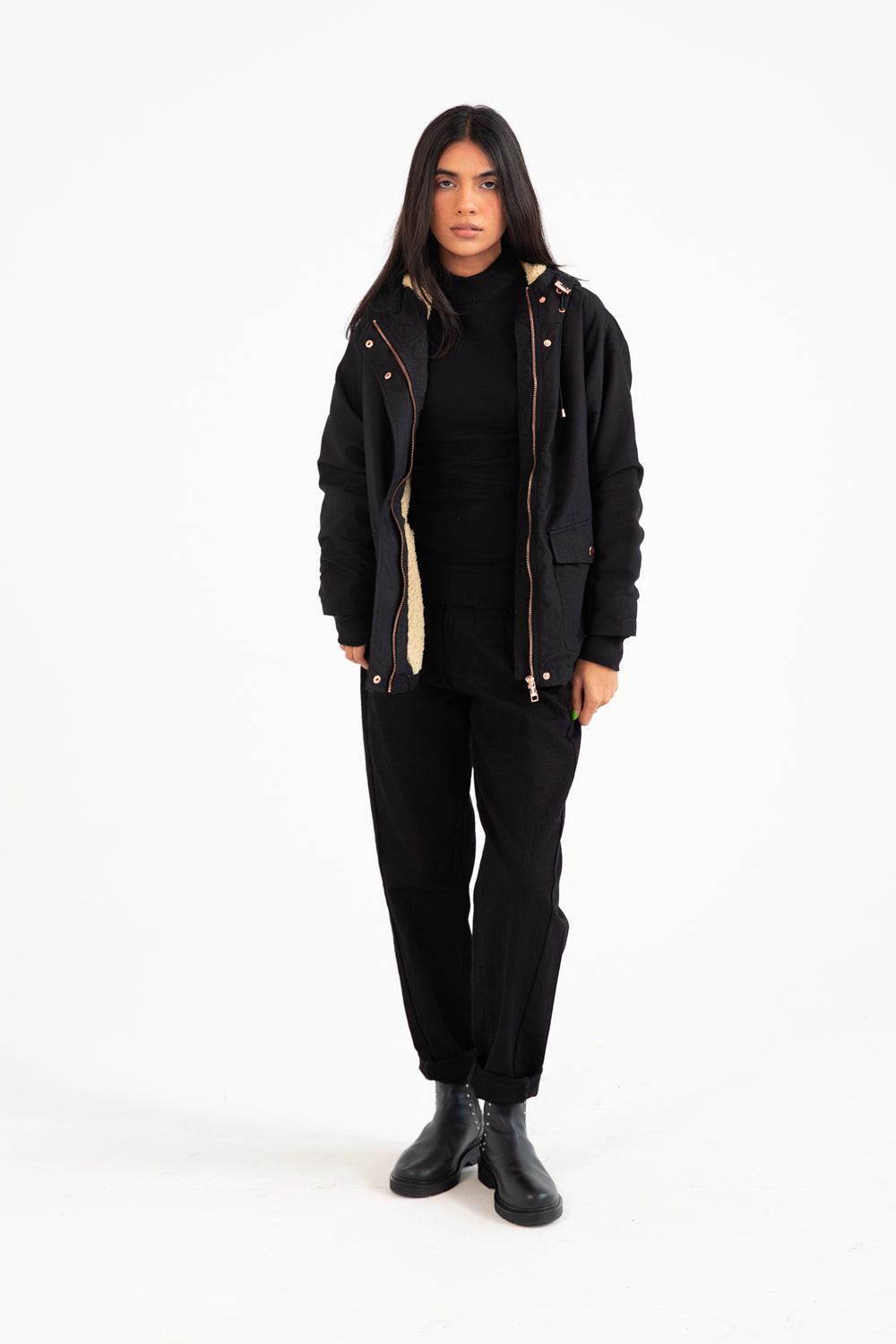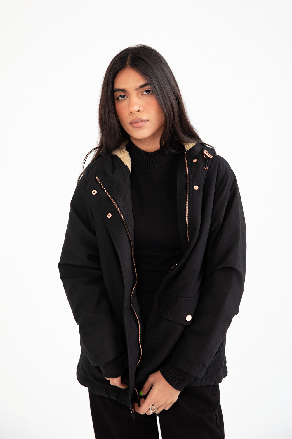 A black jacket with a warm sherpa lining, finished with rose gold hardware, multiple pockets, and a closure that combines a zipper with snap buttons.