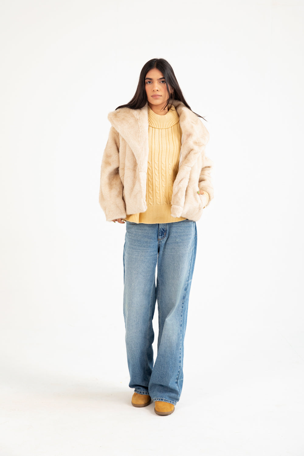 A beige fur jacket in a wool blend with a wide collar that drapes over the shoulders, designed with side welt pockets and an open front.