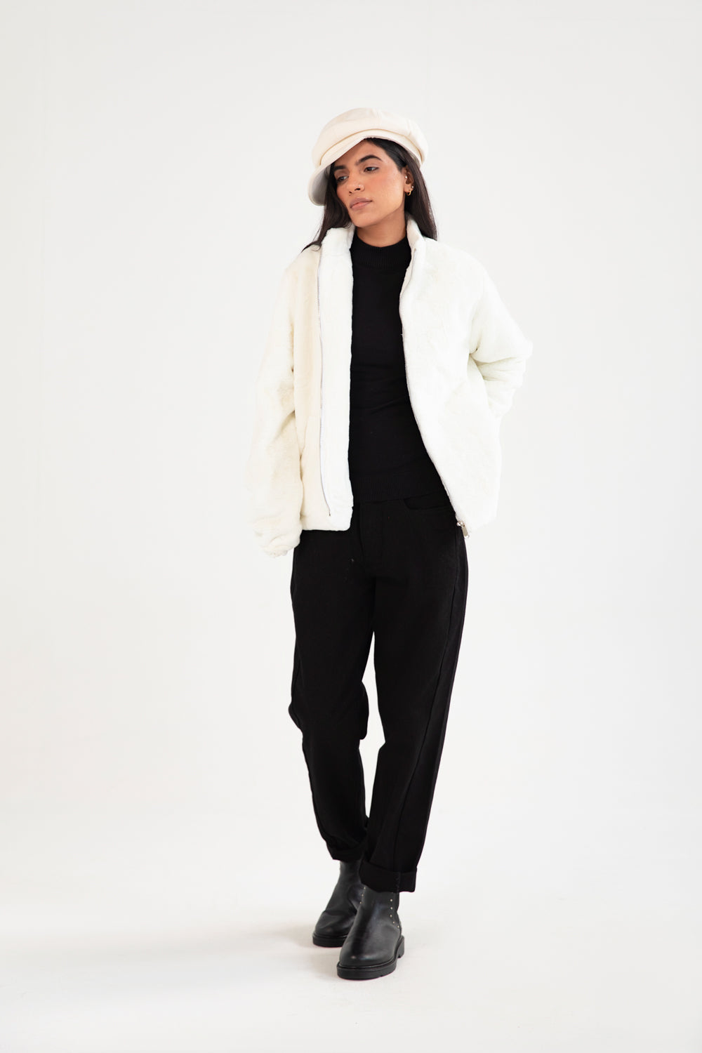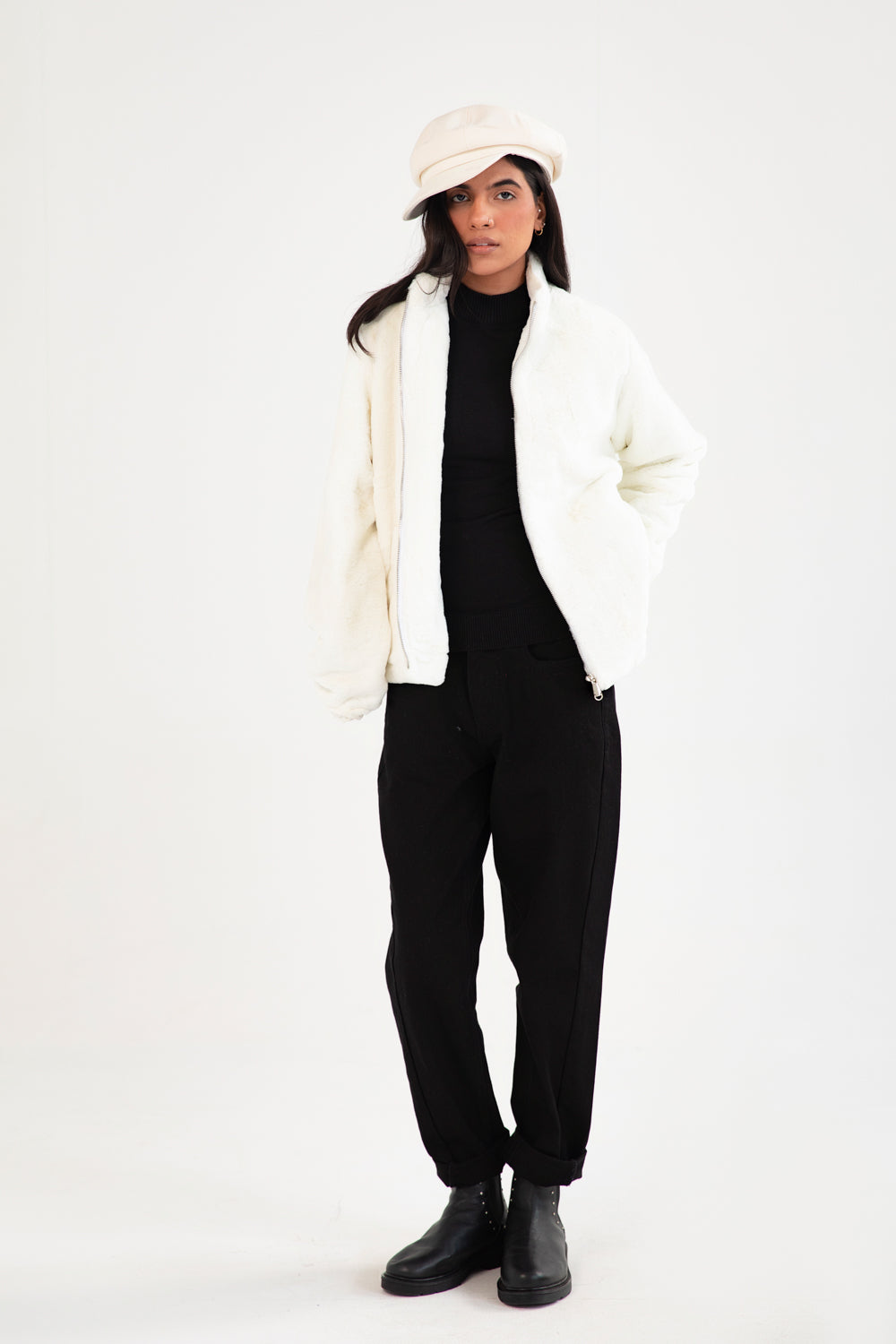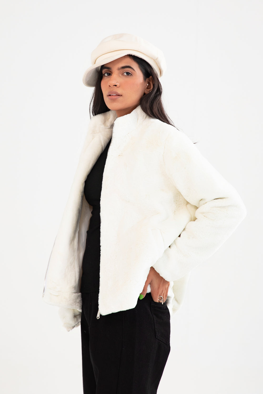 An off white fur jacket with a mock neck, finished with side welt pockets and a simple zipper closure.