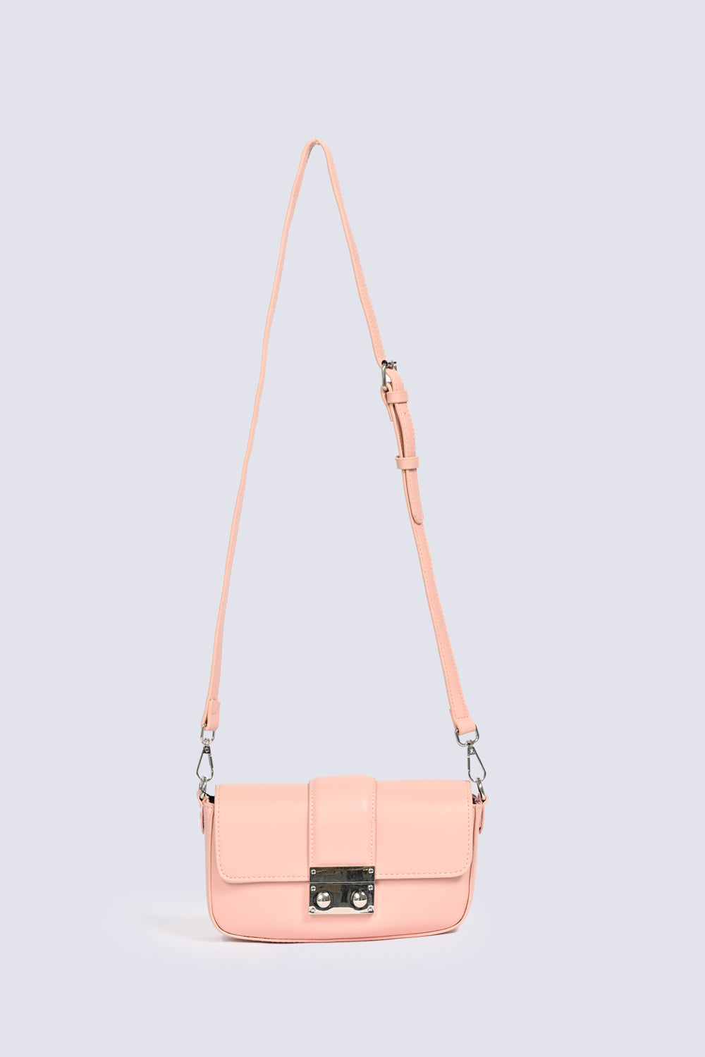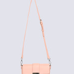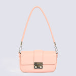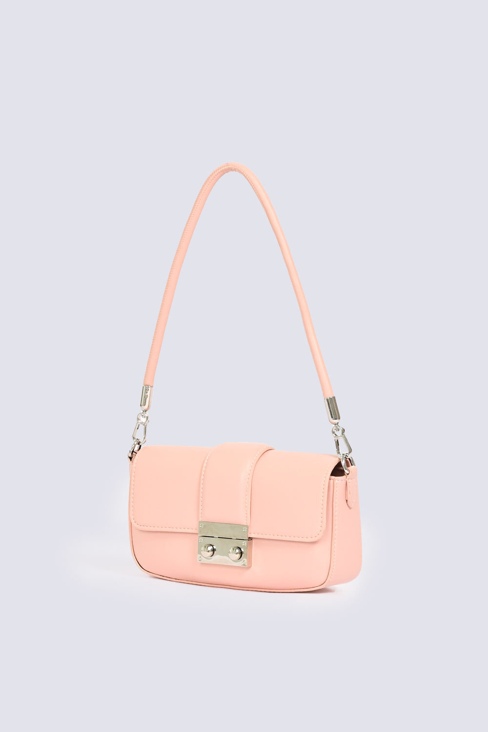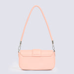 Pastel pink shoulder bag with a flap closure and silver accents, complete with two detachable straps for styling options.