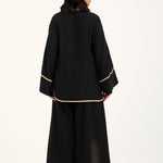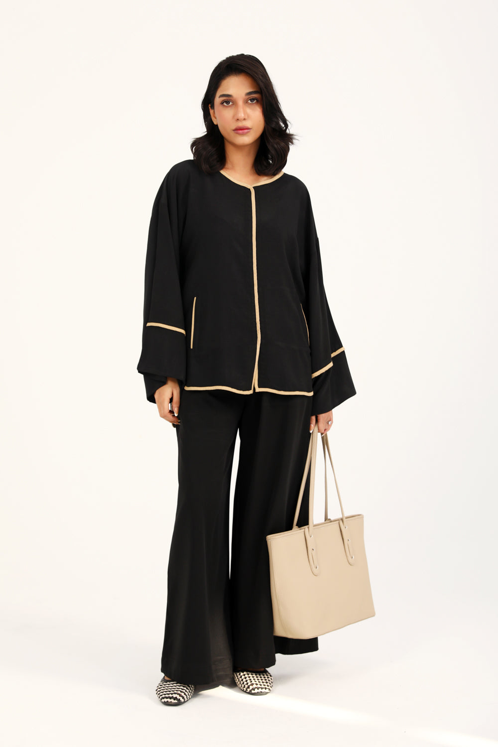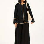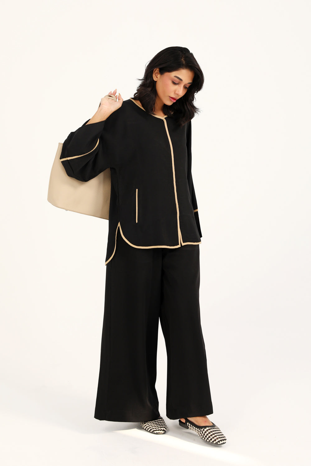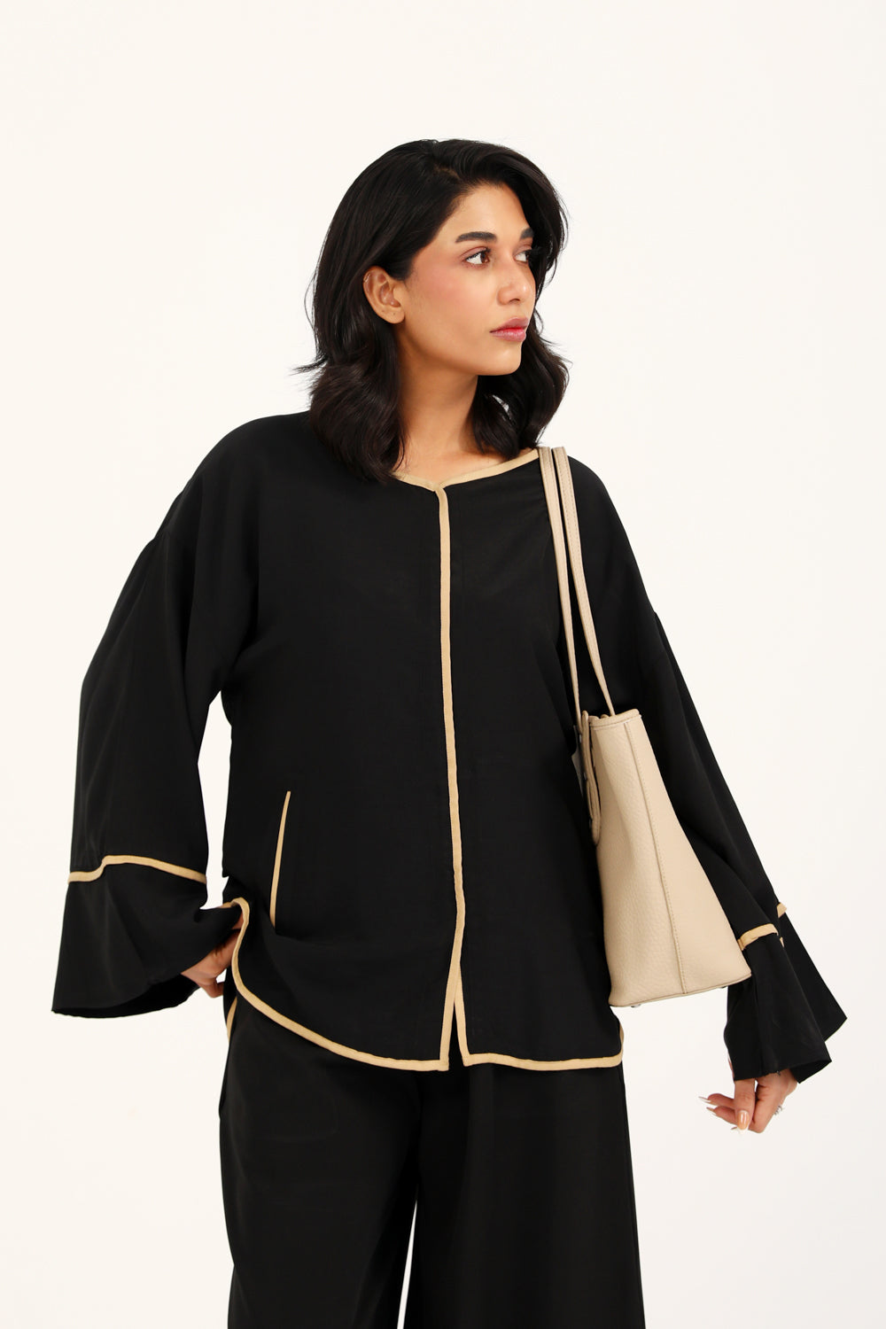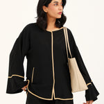 Button down top in plain black featuring contrasting beige trims all over and full length wide sleeves.