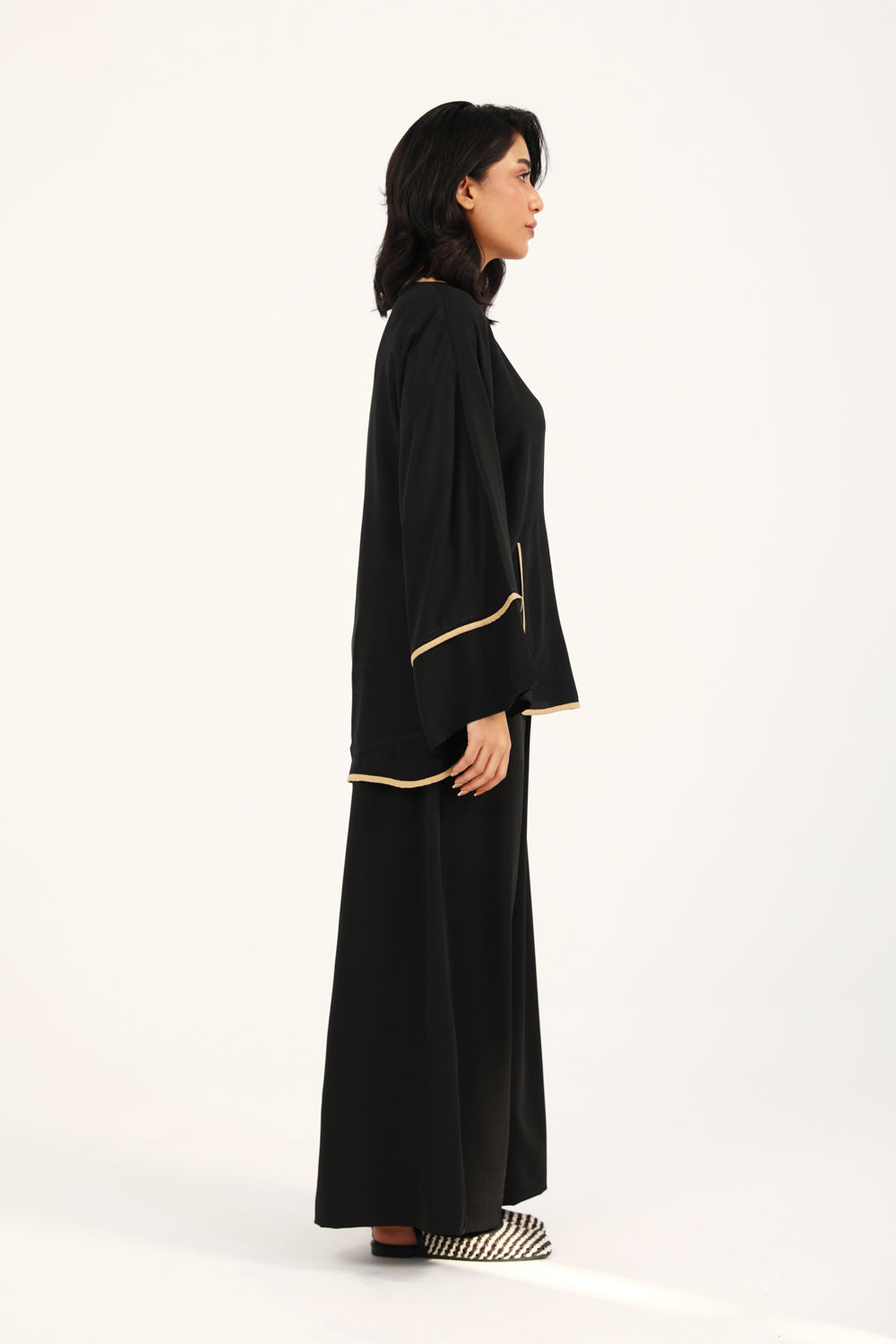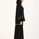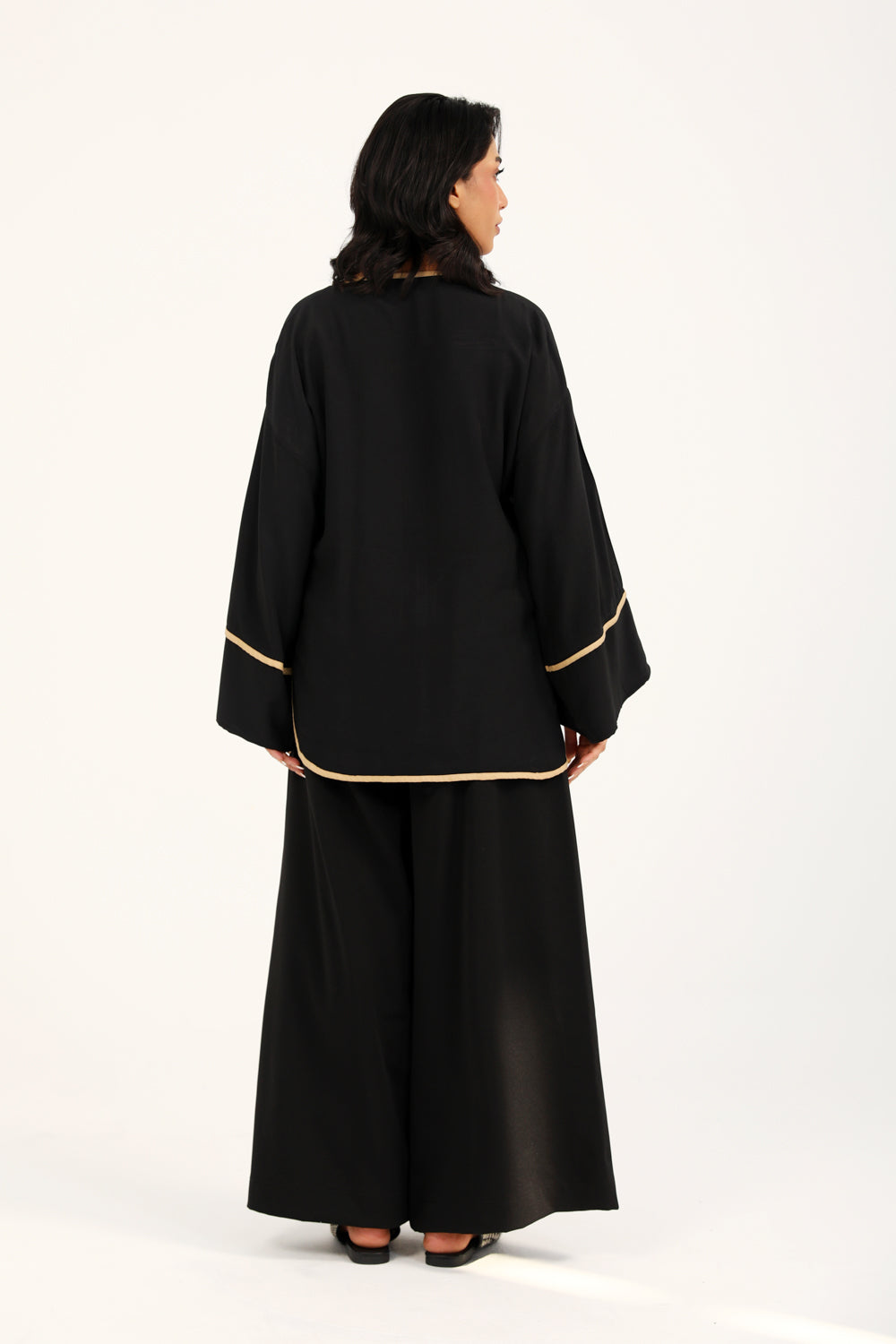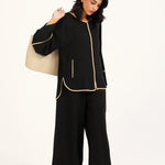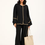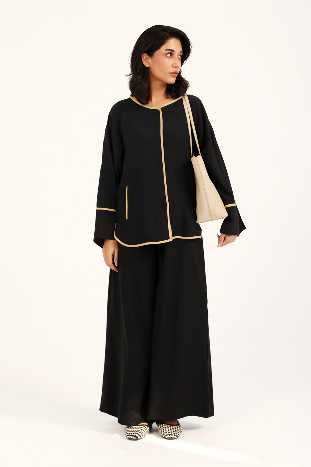 Button down top in plain black featuring contrasting beige trims all over and full length wide sleeves.