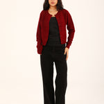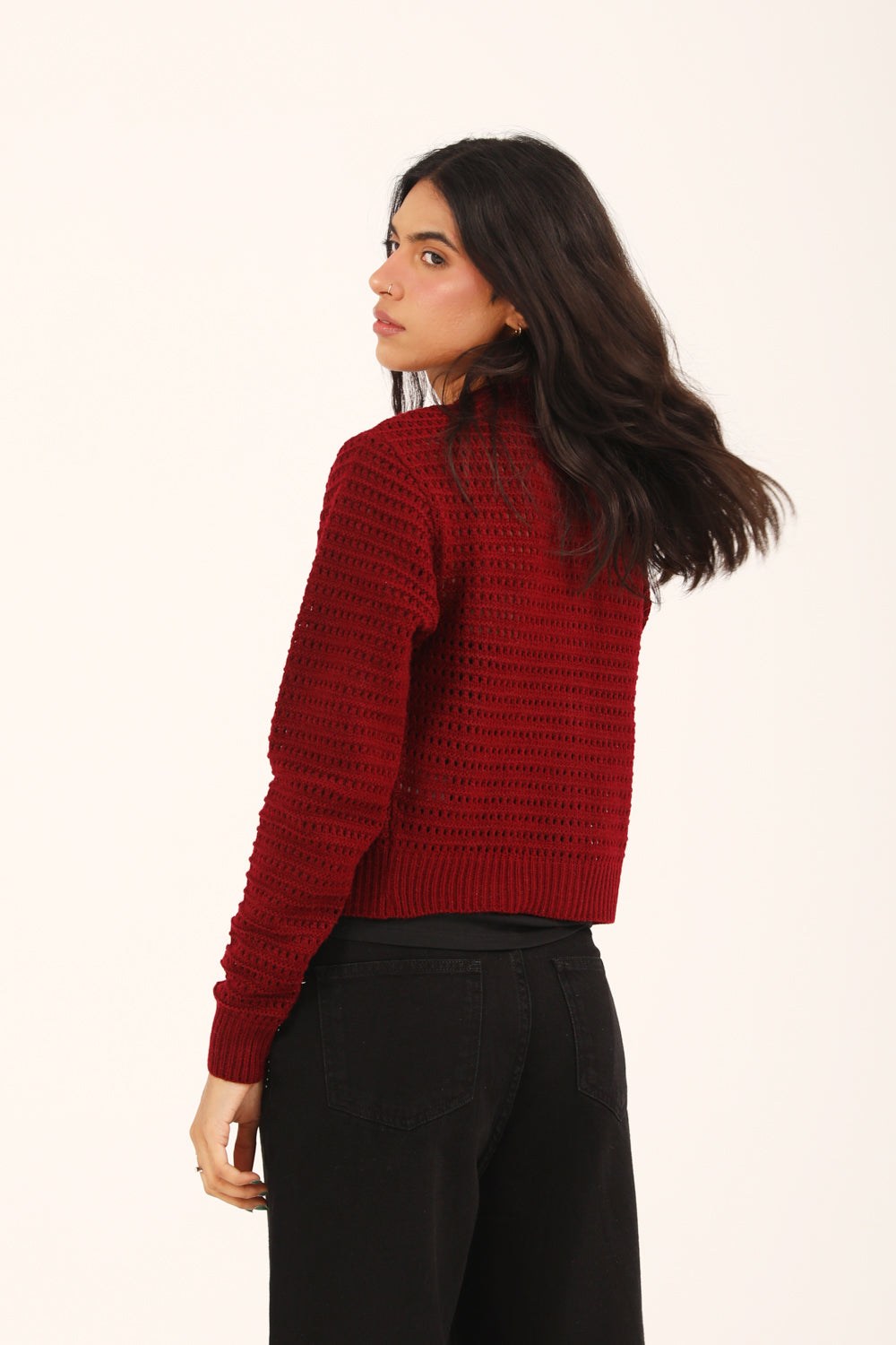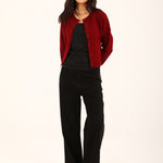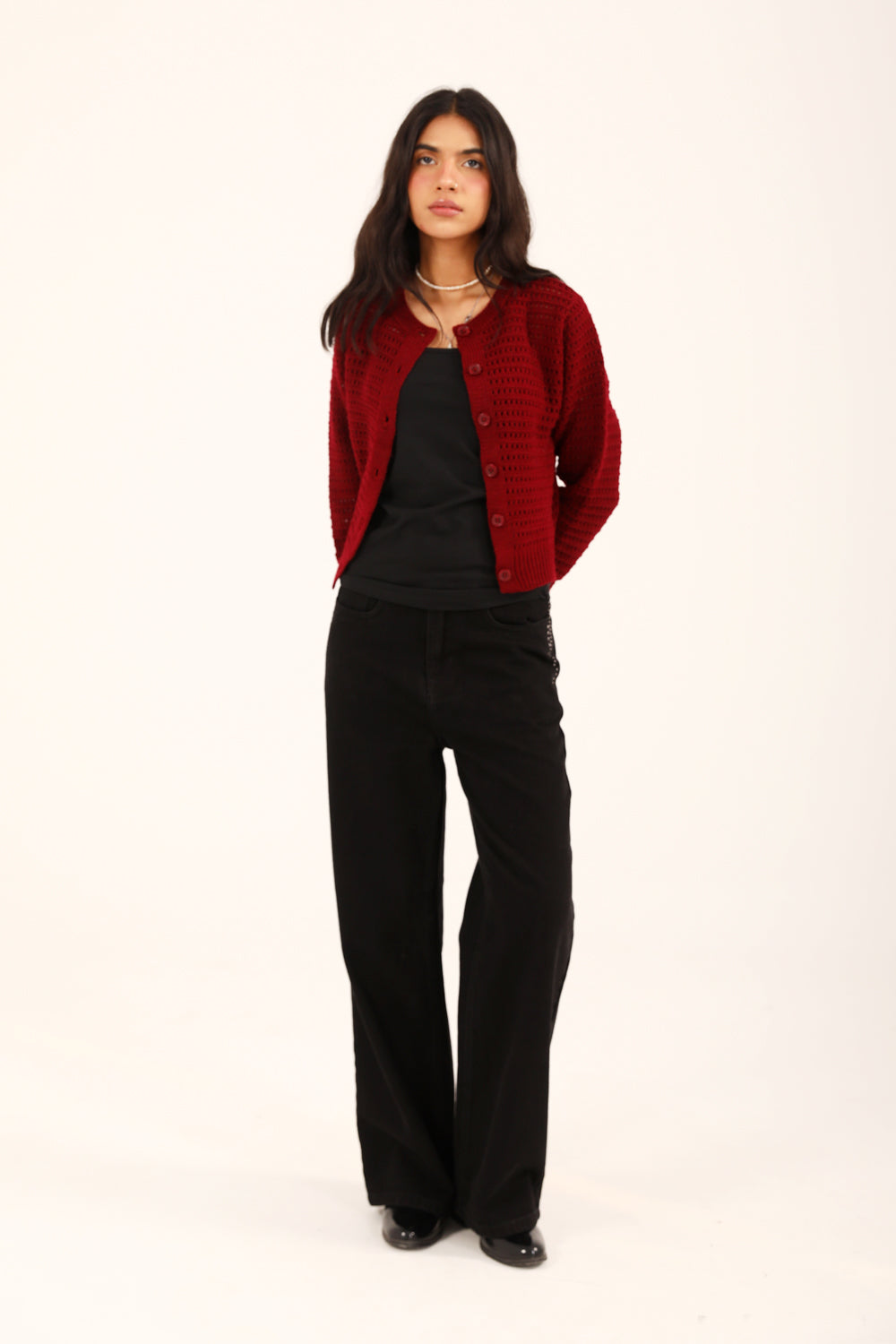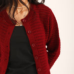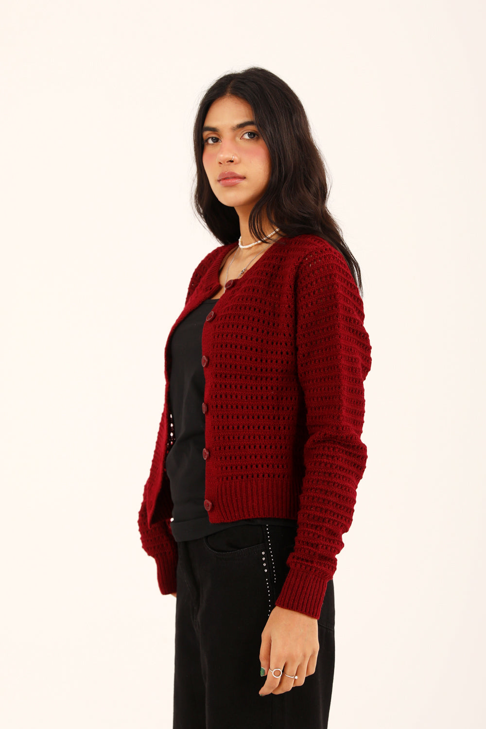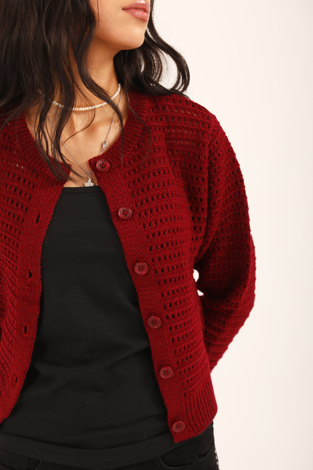 A burgundy textured cropped cardigan in a soft knit, finished with matching buttons.