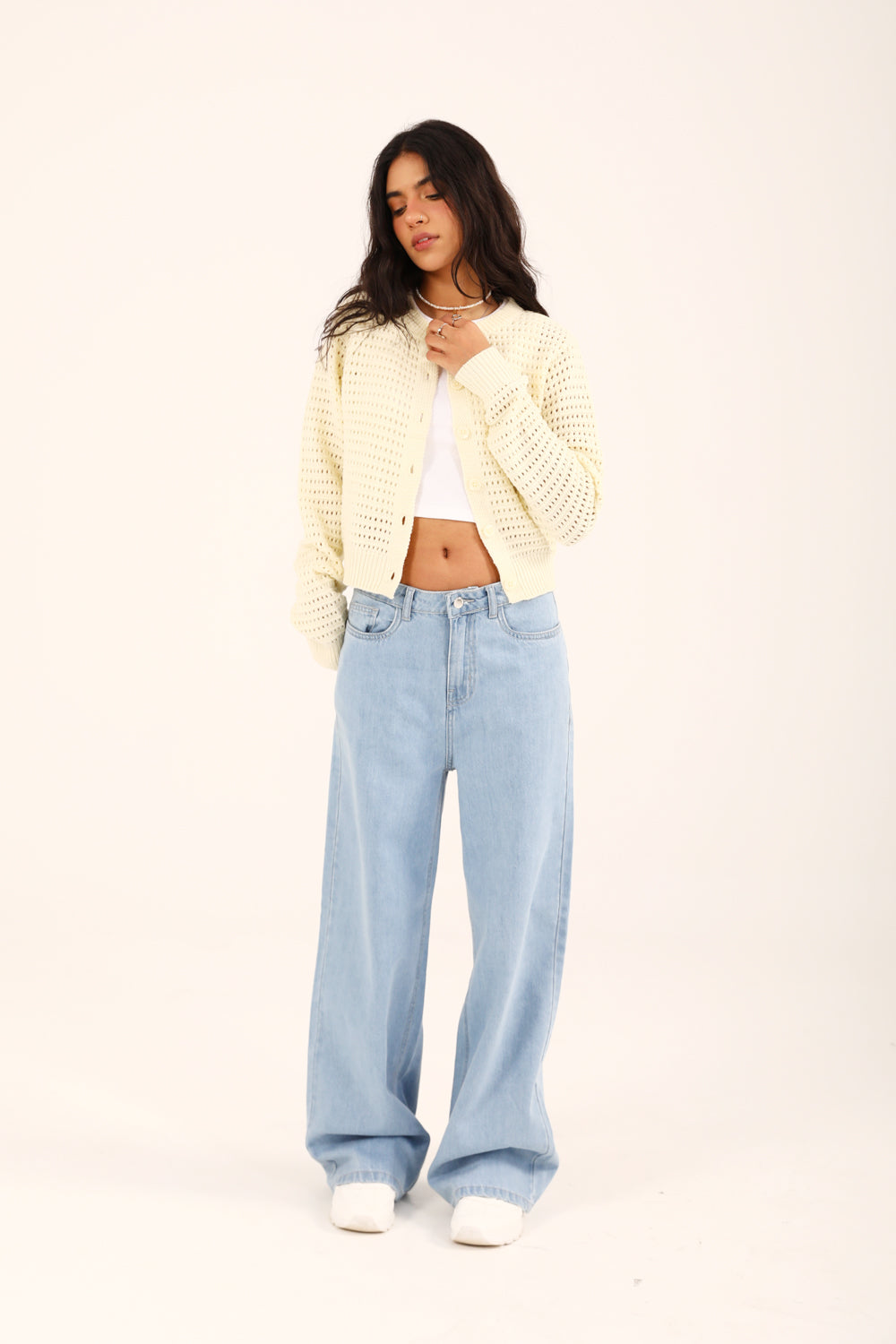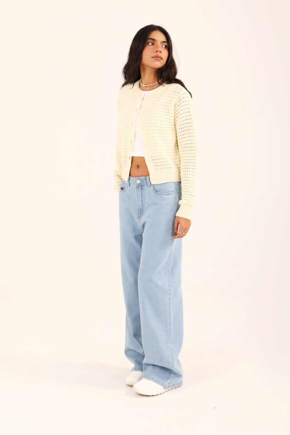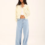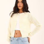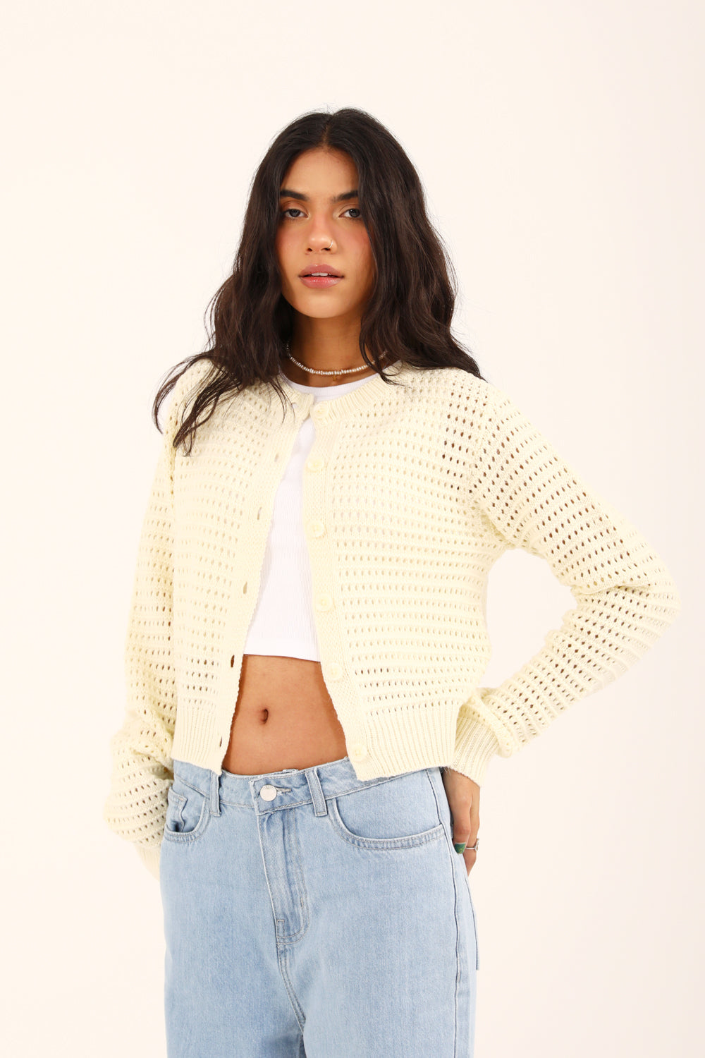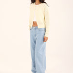 An off-white textured cropped cardigan in a soft knit, finished with matching buttons.