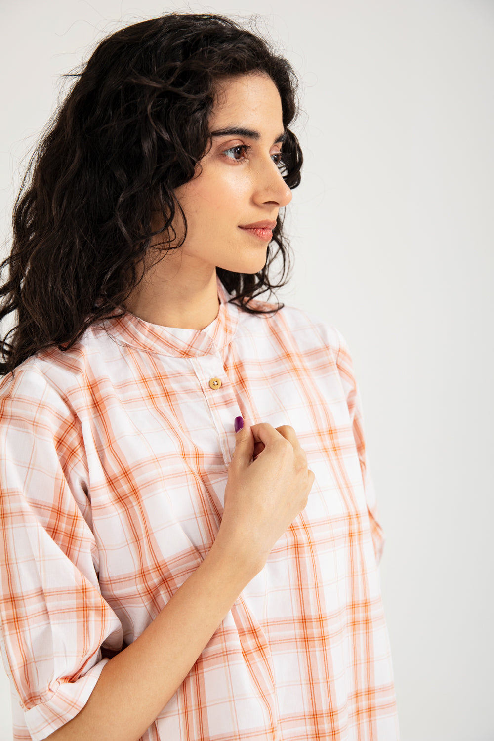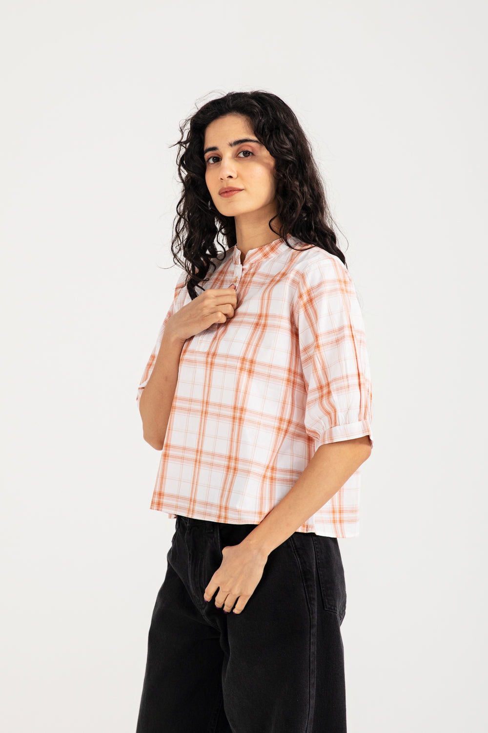 Cotton cropped top in an orange and white checkered pattern, featuring a two button placket and half length cuffed sleeves.